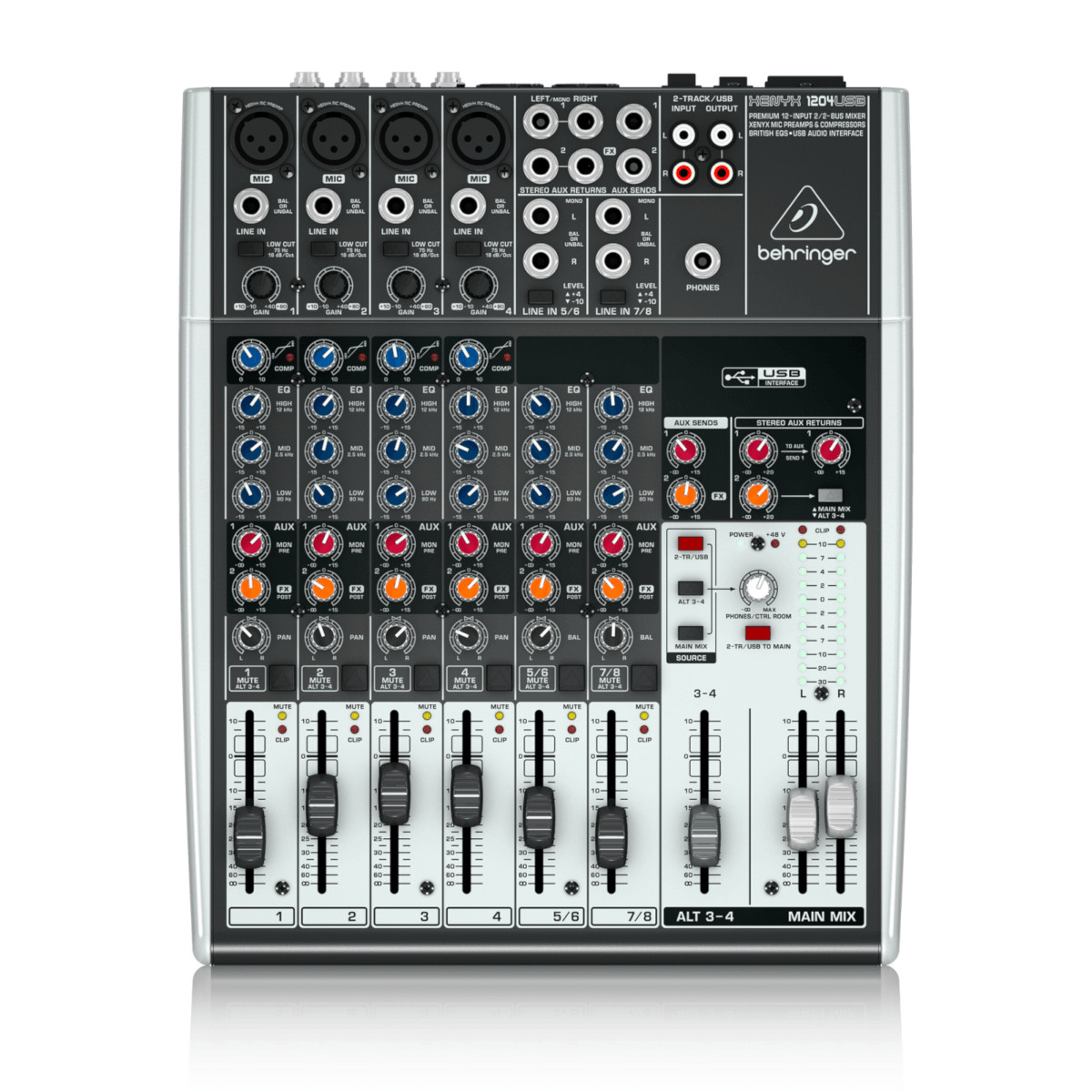 El mezclador USB Behringer Xenyx 1204USB facilita la mezcla de hasta seis canales de audio a un precio económico. Obtiene cuatro preamplificadores de micrófono Xenyx en los primeros cuatro canales, más dos canales estéreo adicionales para fuentes de nivel de línea. El diseño de 2 buses le permite enrutar señales a una fuente alternativa, mientras que dos envíos auxiliares por canal mejoran aún más sus opciones de enrutamiento. El 1204USB también lo ayuda a sonar mejor, con compresión de 1 perilla y ecualizadores de 3 bandas. Lo mejor de todo es que puede grabar fácilmente la salida estéreo del 1204USB a su computadora a través de USB. Incluso viene con un paquete de software gratuito de grabación y podcasting. Ya sea que esté mezclando audio en vivo o grabando en su estudio casero, el Xenyx 1204USB le ofrece muchas funciones a un precio económico.