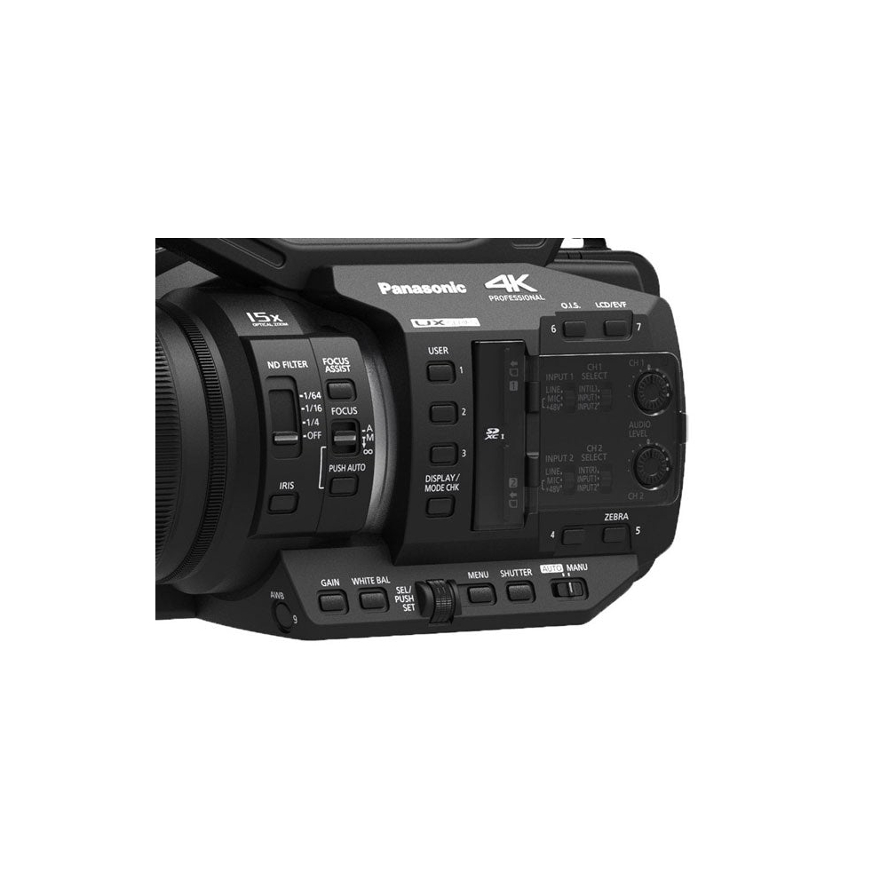 Para una amplia gama de opciones profesionales y de alta resolución cuando esté en movimiento o en el estudio, use la videocámara Panasonic AG-UX90 UHD 4K para grabar videos de hasta UHD 3840 x 2160 y gamma de 8 modos. La AG-UX90 cuenta con un gran sensor MOS tipo 1.0 que crea un efecto bokeh dramático con su lente gran angular y su distancia focal con rangos de zoom óptico de 15x de 25,4 a 367,5 mm. El Estabilizador de Imagen Híbrido de 5 ejes de la cámara proporciona una corrección anti-vibración para un movimiento suave, y el diseño de lente de 3 anillos permite un control manual preciso del iris/enfoque/zoom. El sistema de obturador funciona en tres modos: sistema, lento y escaneo sincronizado, que permiten velocidades de obturación de 1/60 a 1/8000 por segundo. El interruptor de ganancia variable de tres pasos permite un mayor control sobre el brillo y el obturador.