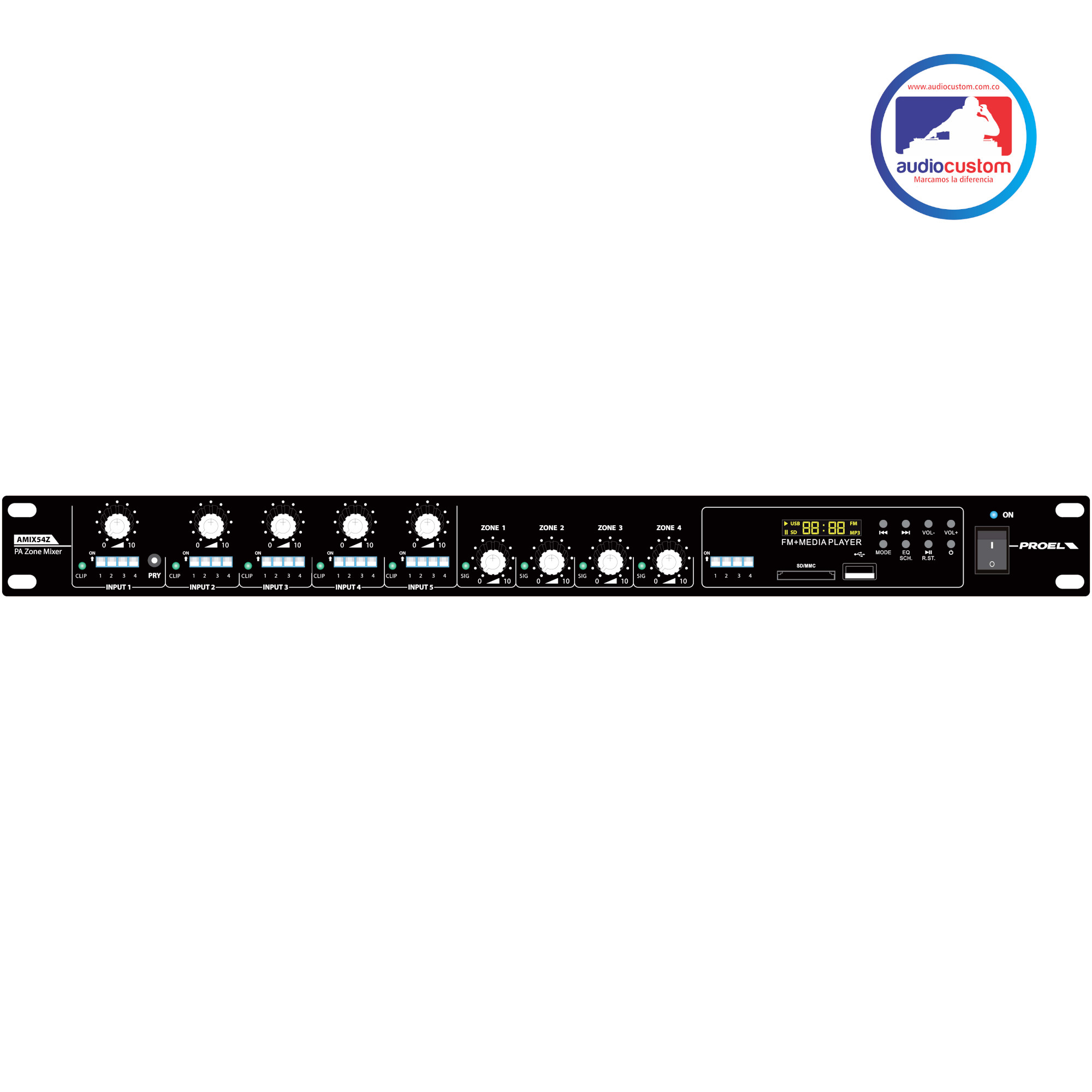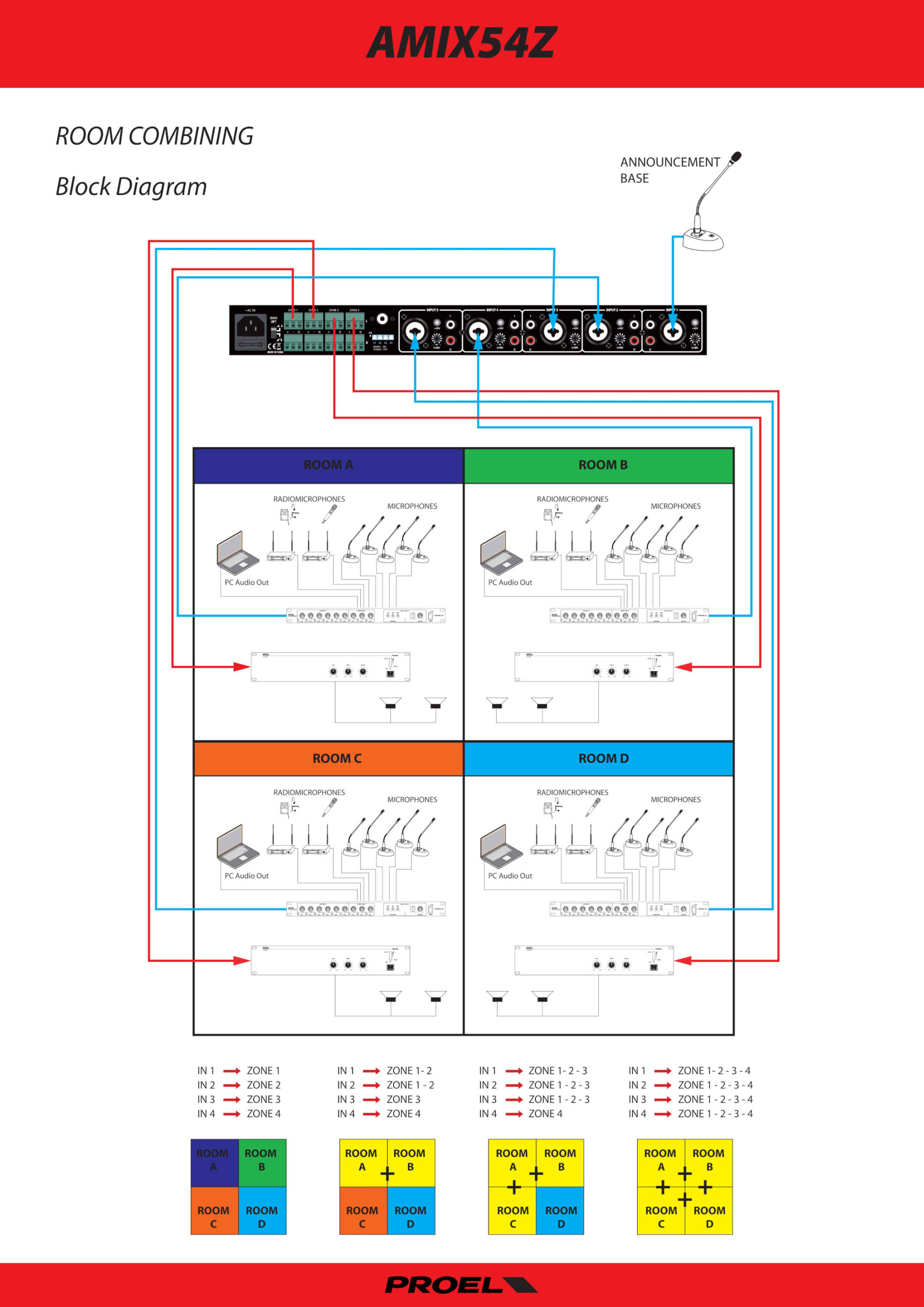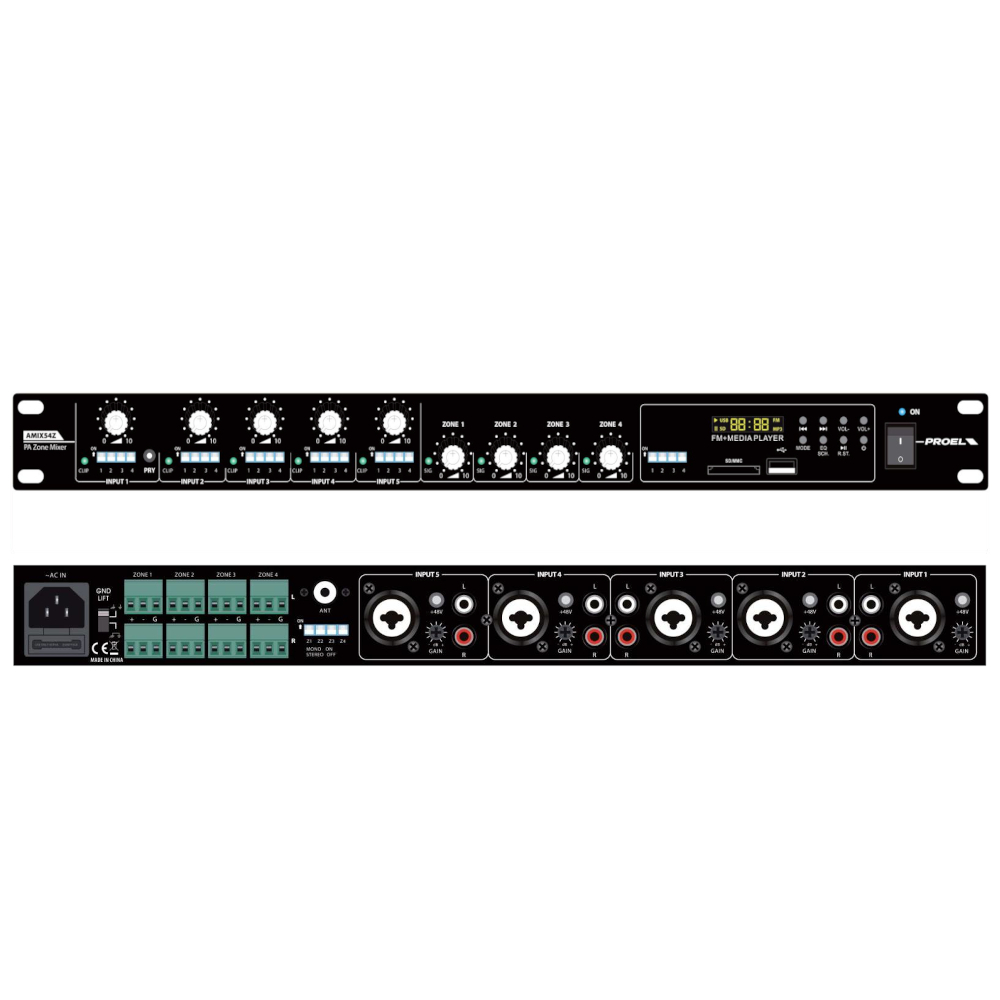 Proel AMX4Z es un mezclador particular de 4 zonas de salida diseñado específicamente para cumplir con las funciones de combinación de habitaciones. Esta aplicación particular está presente en salas de conferencias y hoteles donde se utilizan separaciones móviles entre diferentes ambientes. La instalación de audio de estos ambientes puede configurarse de forma independiente o combinada en un único sistema. AMIX4Z cuenta con 4 salidas RCA / Jack 6,3 líneas y una entrada de micrófono de pie BM100. Ajuste independiente y control de volumen para estas 5 entradas El control principal principal se puede configurar a través de la salida de auriculares conmutable entre las cuatro salidas de zonas.