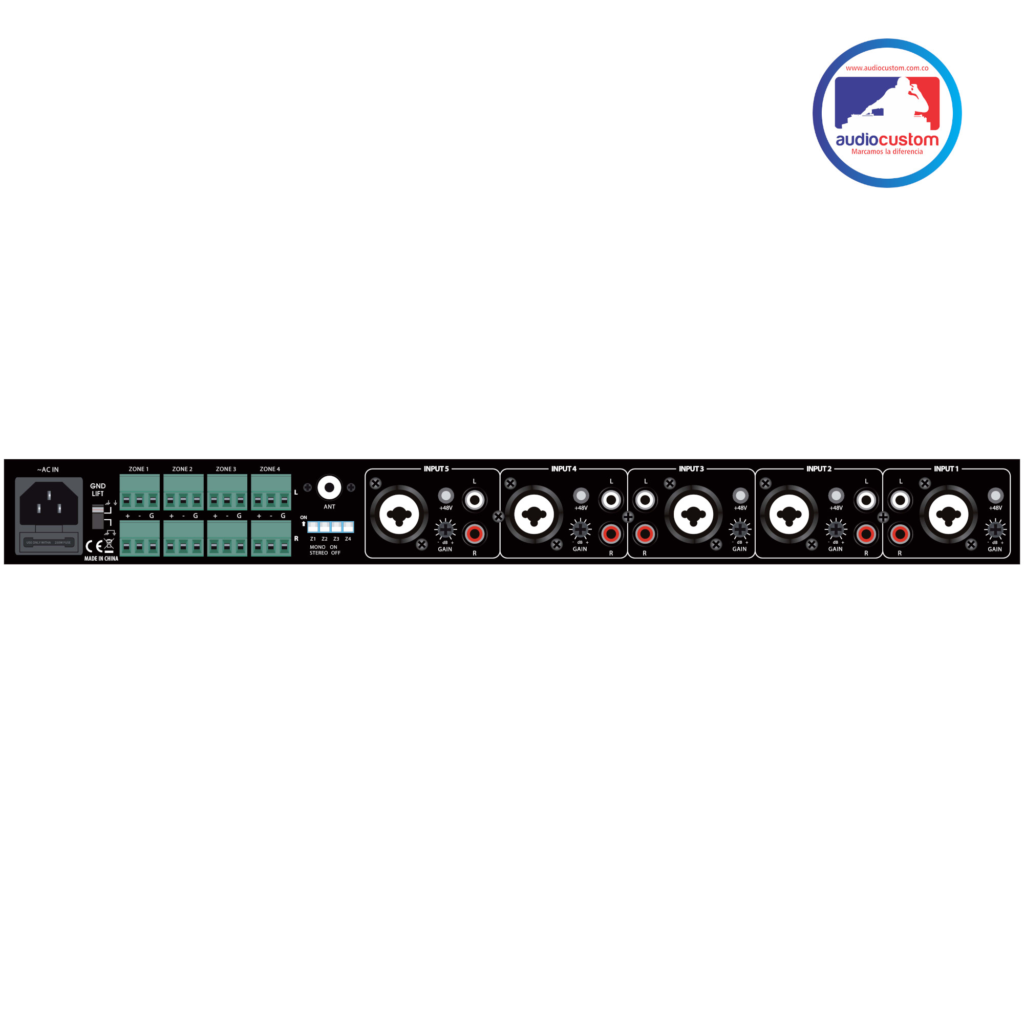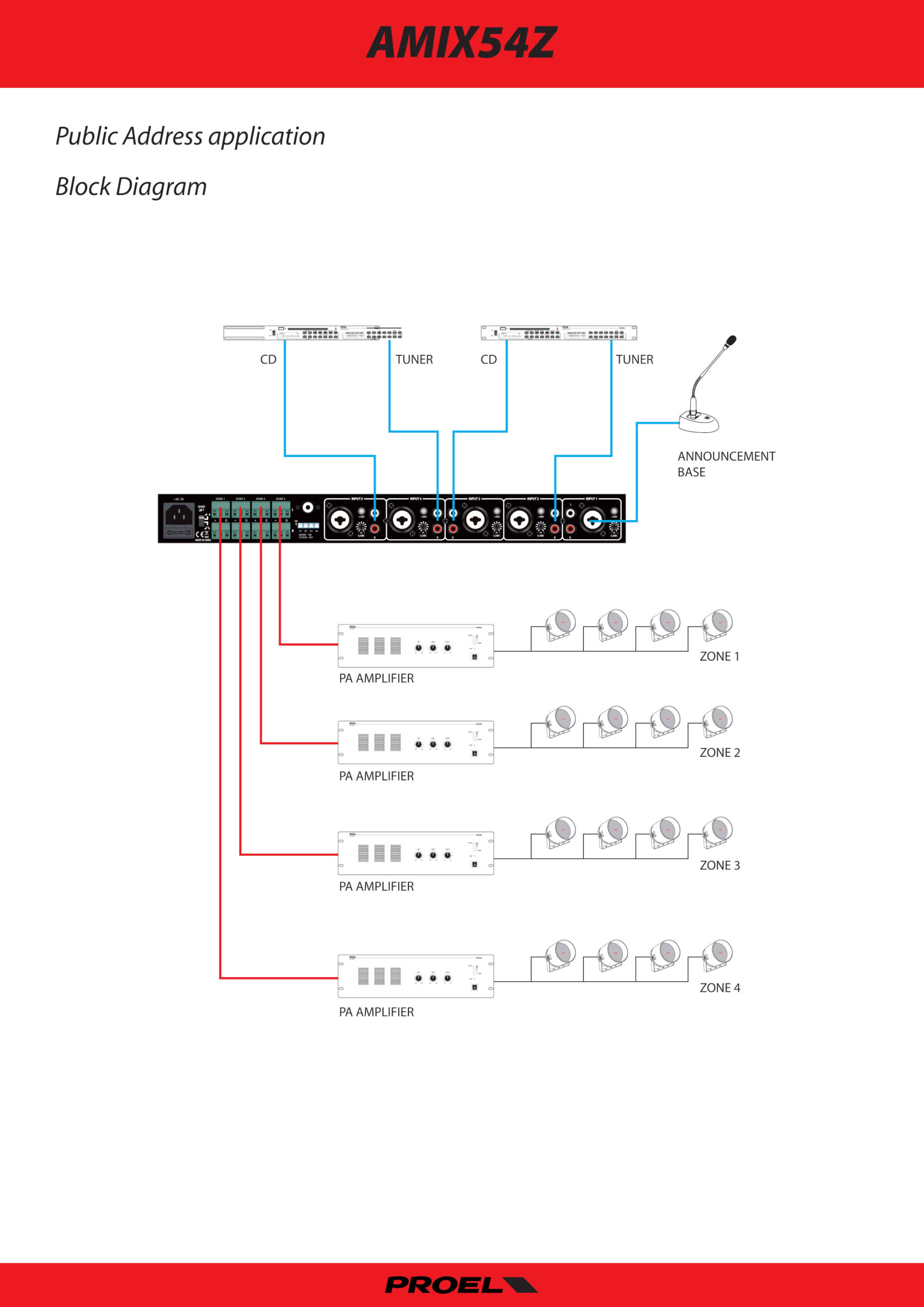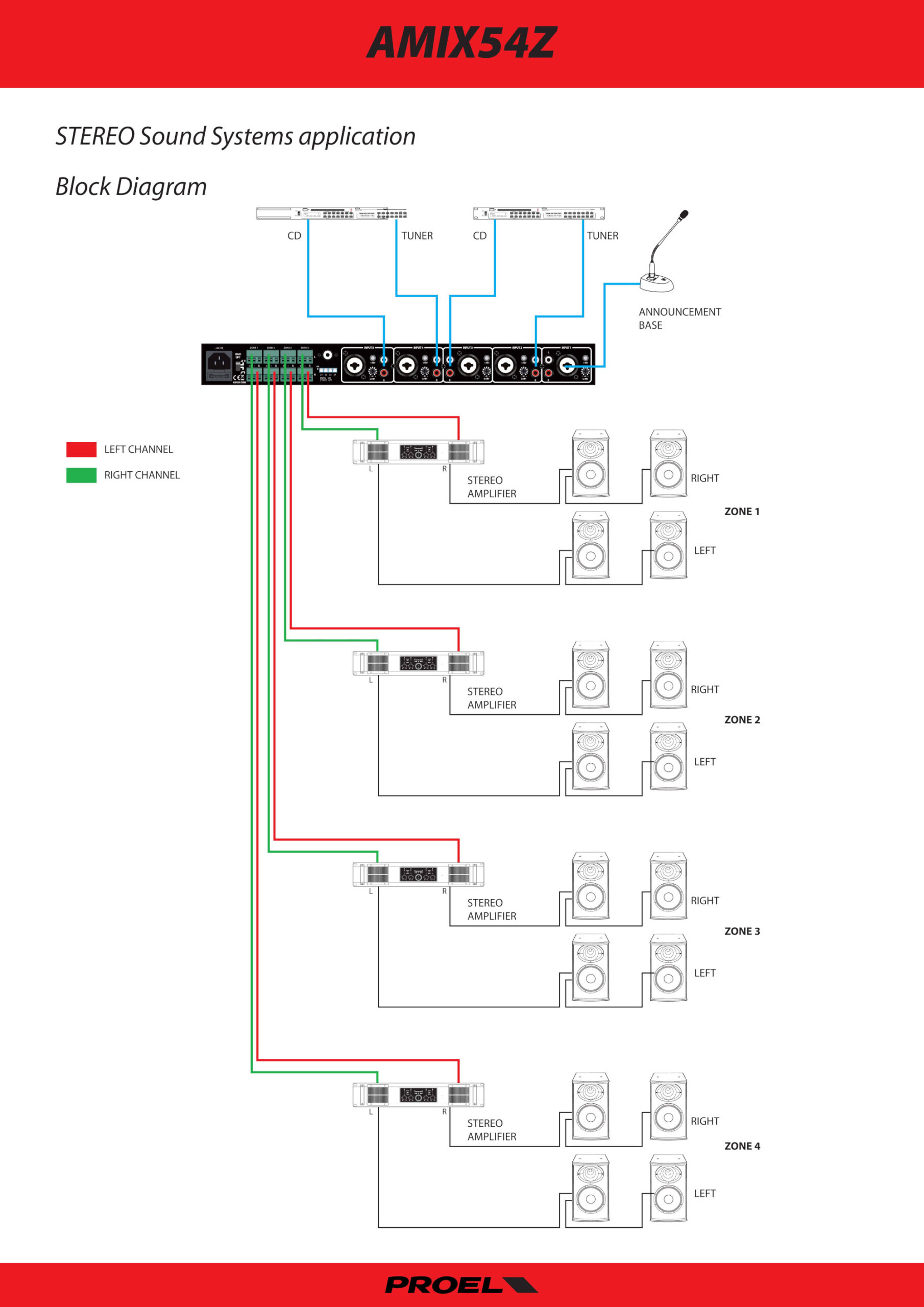 Proel AMX4Z es un mezclador particular de 4 zonas de salida diseñado específicamente para cumplir con las funciones de combinación de habitaciones. Esta aplicación particular está presente en salas de conferencias y hoteles donde se utilizan separaciones móviles entre diferentes ambientes. La instalación de audio de estos ambientes puede configurarse de forma independiente o combinada en un único sistema. AMIX4Z cuenta con 4 salidas RCA / Jack 6,3 líneas y una entrada de micrófono de pie BM100. Ajuste independiente y control de volumen para estas 5 entradas El control principal principal se puede configurar a través de la salida de auriculares conmutable entre las cuatro salidas de zonas.