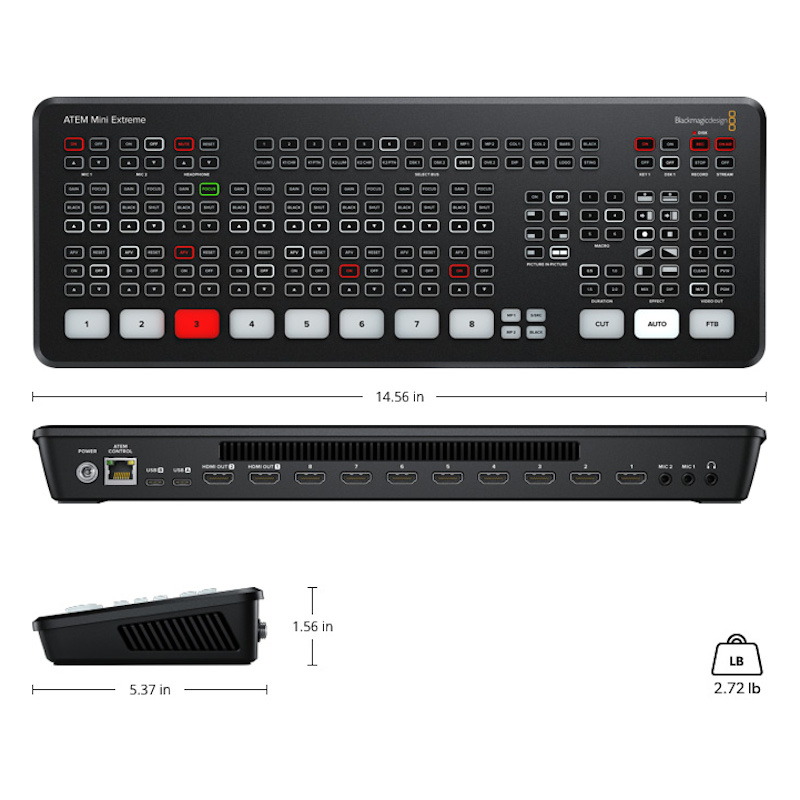 ¡ATEM Mini Extreme es un conmutador avanzado para verdaderos profesionales! Obtiene todas las características de ATEM Mini Pro más 8 entradas HDMI, 2 salidas HDMI separadas, 2 puertos USB y una conexión para auriculares. ¡También hay 4 incrustadores de croma, 6 DVE de imagen en imagen, 2 reproductores multimedia y una vista múltiple con hasta 16 vistas!
