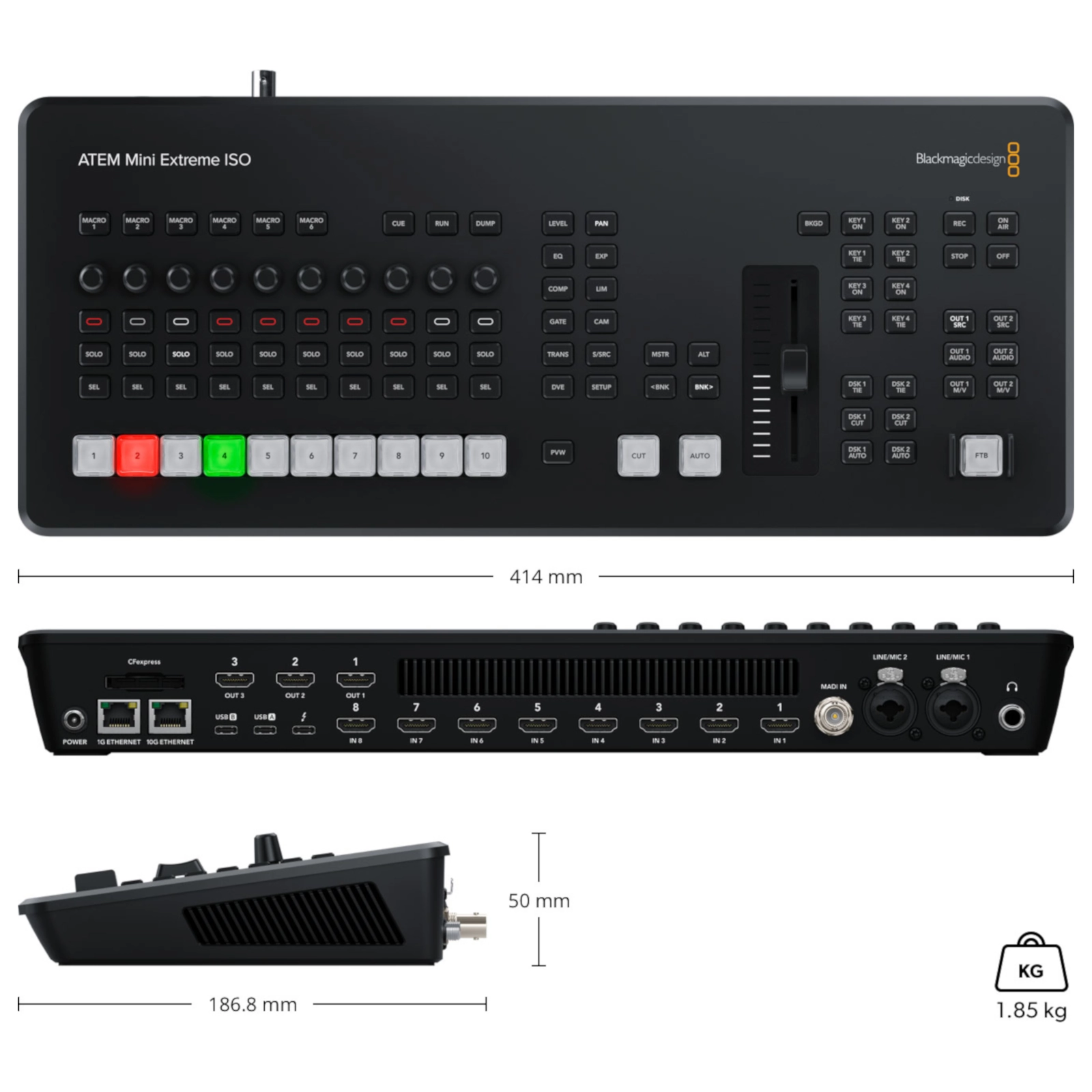 Este excepcional mezclador compacto para producciones en estudios de alta gama incluye un panel de control profesional, 8 entradas HDMI con conversión de formatos, 3 salidas HDMI independientes, motor de transmisión integrado, visualización simultánea, compartimiento para tarjetas CFexpress y tecnología Thunderbolt para grabar y reproducir imágenes. Por otra parte, dispone de una conexión Ethernet 10G para acceder a unidades de almacenamiento en red rápidamente, entradas de audio XLR, un reproductor multimedia y un puerto USB que permite detectarlo como una cámara web. Además, permite realizar composiciones por crominancia y grabar las 8 fuentes conectadas individualmente.