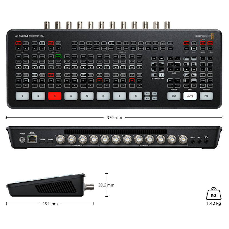 Mezclador de video profesional con 8 entradas HDMI, 16 ventanas de visualización simultánea, 4 compositores por crominancia avanzados, función SuperSource con 4 canales para efectos visuales, 2 salidas HDMI, 2 puertos USB y panel de control de mayor capacidad, permite grabar hasta nueve señales en formato H.264 en tiempo real, es decir, el programa y las ocho fuentes conectadas. Asimismo, se crea un archivo de proyecto de DaVinci Resolve que brinda la posibilidad de editar la producción.