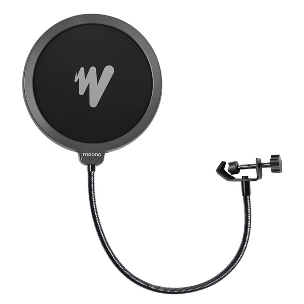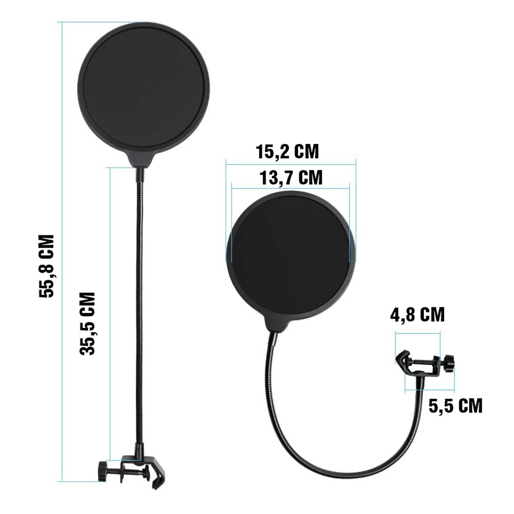 Pantalla anti pop con 180º de ángulo regulable, montada al brazo con rosca universal.