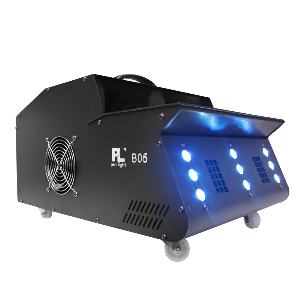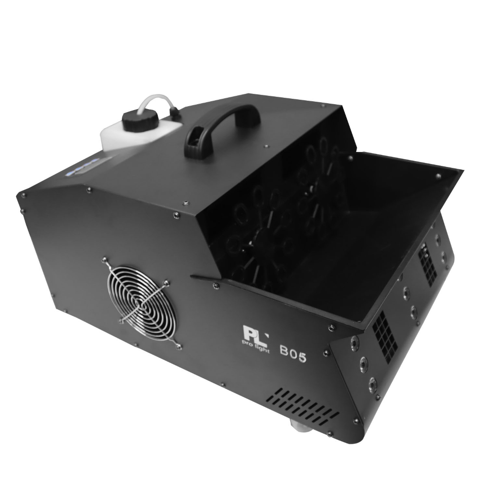 B05 de PL Pro Light es una potente maquina 3 en 1 que ofrece un atractivo juego de luces, maquina de humo y generador de burbujas. Diseñada para fiestas, eventos, minitecas, Halloween, Navidad o decoración. Esta maquina híbrida arroja un humo espeso sobre la pista con un alcance de 5 metros (sin viento) el humo puede verse en colores gracias a su sistema de 9 LEDs RGB (Rojo, Verde, Azul) en la parte frontal. Sumado a esto puedes generar burbujas que se integraran en el aire formando un bonito efecto de burbujas de humo y color.
