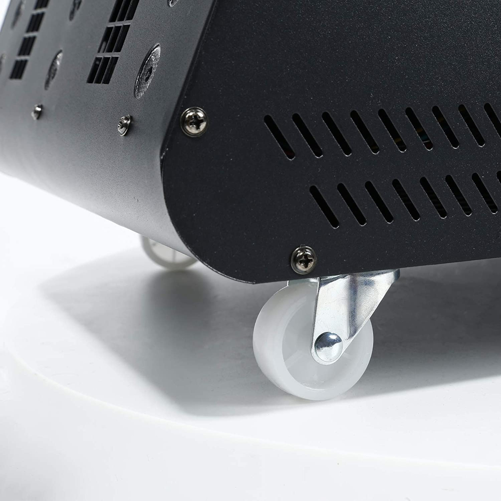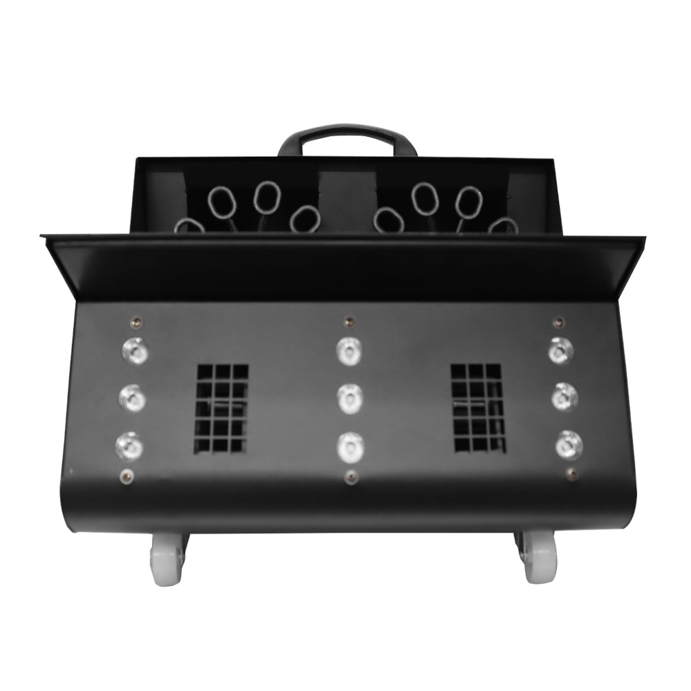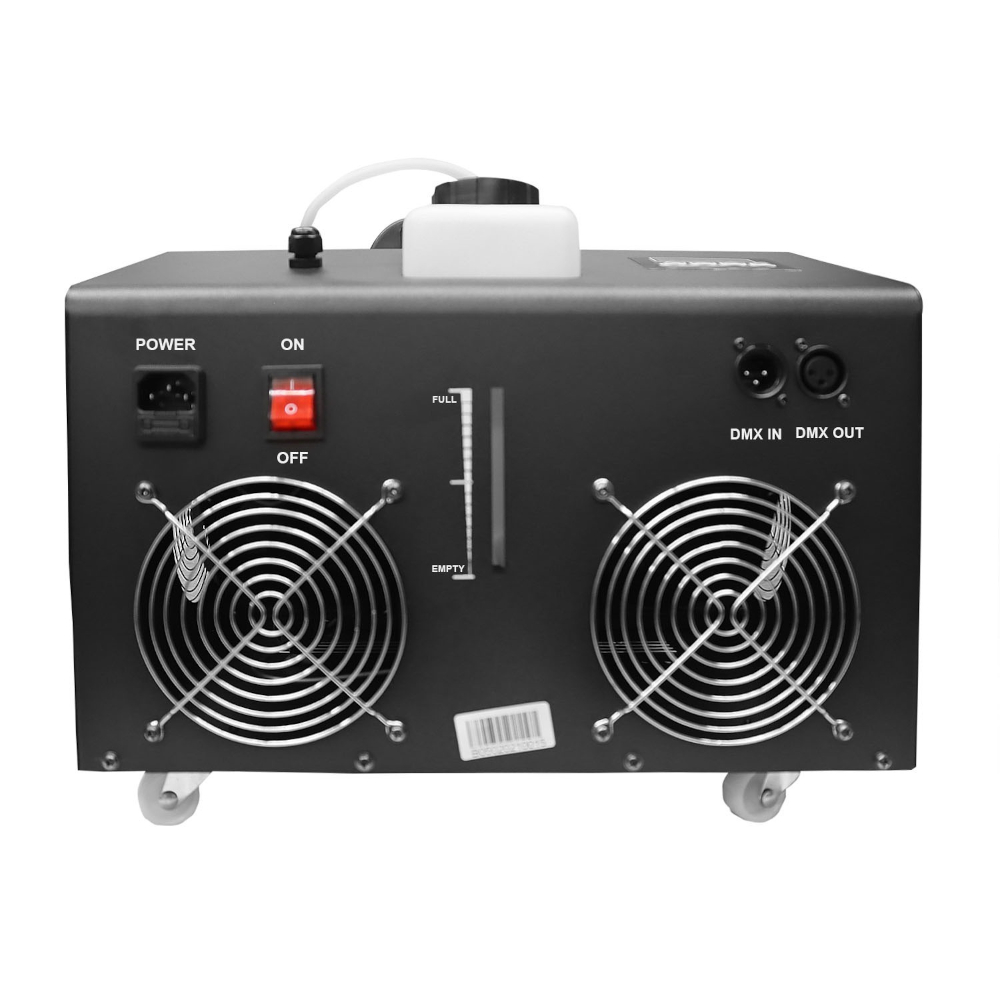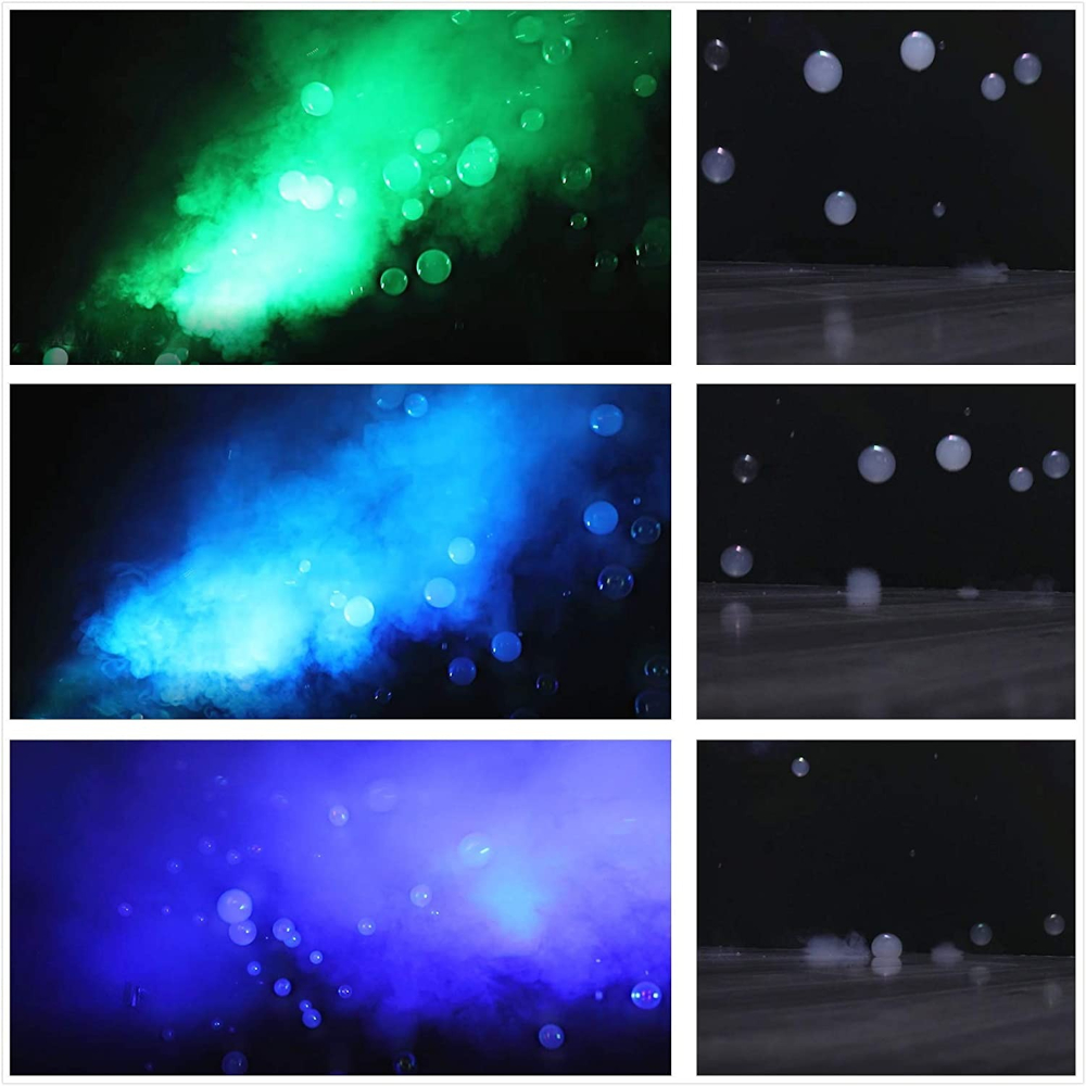El sistema viene equipado con 2 ventiladores de burbujas que se cargan con liquido universal, también incluye un tanque de 1.5 litros para liquido de humo. Las 3 caracteristicas pueden ser controladas por DMX o desde el control inalambrico (incluido)