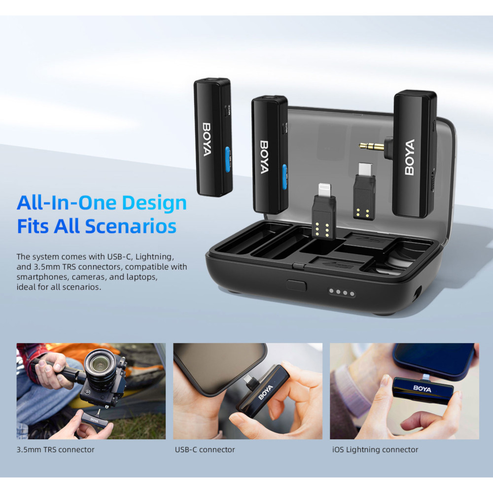 Con el micrófono inalámbrico de solapa BOYALINK tendrás a disposicióndoble transmisor y un receptor en frecuencia digital de 2.4 GHz,y los distintos accesorios para su uso en el campo del video de manera innovadora.