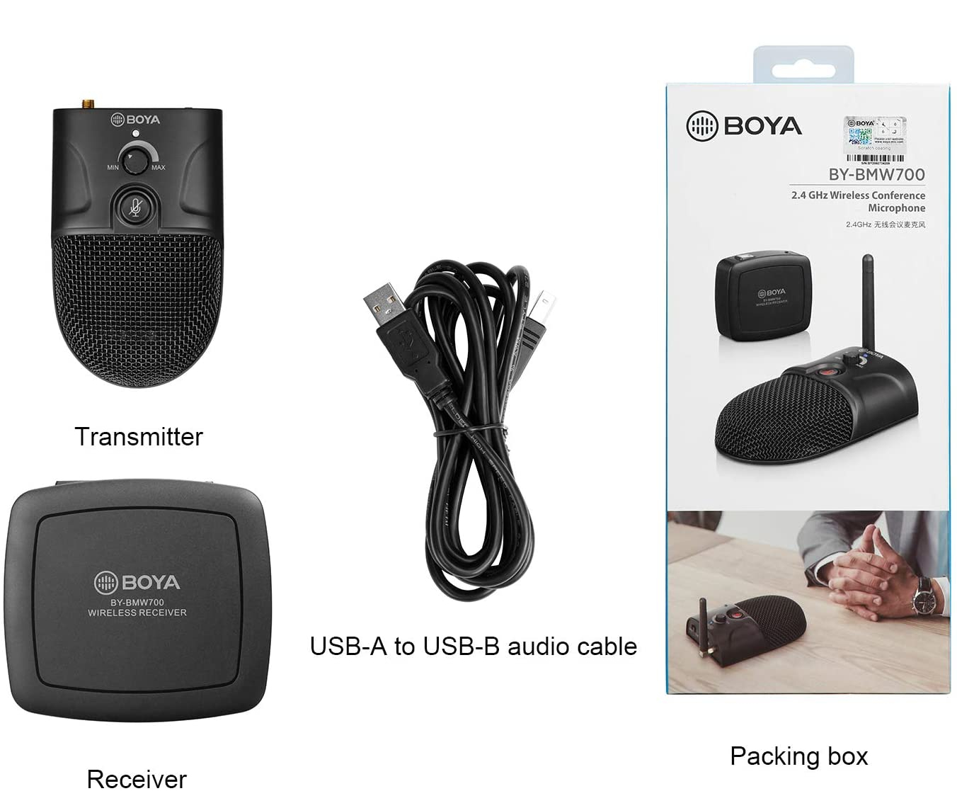 Micrófono de conferencia inalámbrico de 2,4 GHz BOYA BY-BMW700 es el último sistema de micrófono de superficie que consta de un micrófono de condensador y un receptor inalámbrico USB. Fácil de configurar y operar, es ideal para videoconferencias, seminarios y eventos corporativos.