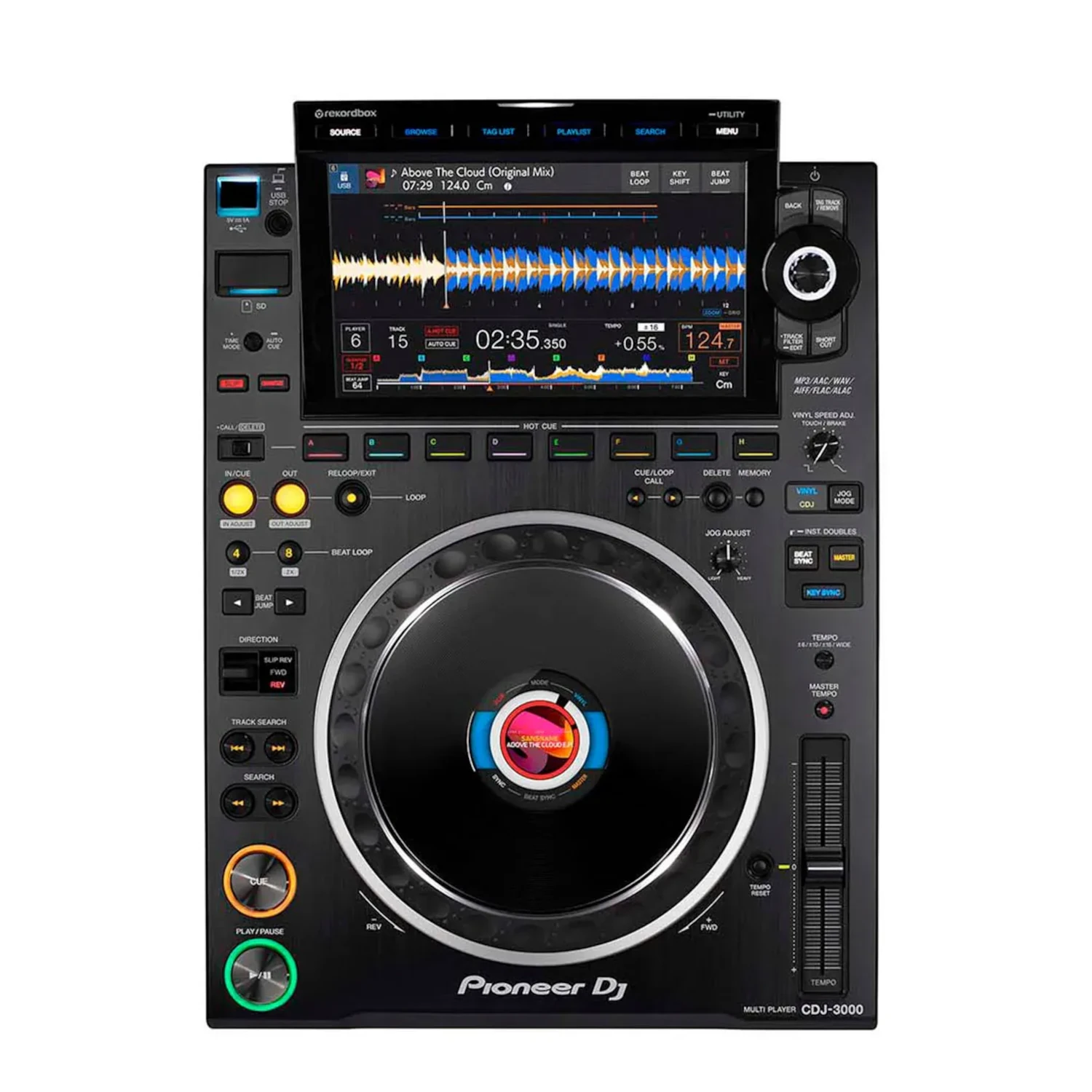 Aumenta tu poder creativo con nuestro más emblemático y evolucionado reproductor múltiple, esta resistente unidad funciona con una nueva MPU y está equipada con componentes de alta calidad especialmente desarrollados y características innovadoras. Compatible con rekordbox CloudDirectPlay, Solo tienes que conectar el CDJ-3000 a Internet mediante una conexión Pro DJ Link con un cable LAN para empezar a utilizar rekordbox CloudDirectPlay. Previamente, exportarás una clave de autentificación desde rekordbox a un dispositivo de almacenamiento USB que, al conectarlo al CDJ-3000, te permitirá navegar y reproducir todas las pistas de tu biblioteca basada en la nube. Haz scratch y altera con precisión el tono de las pistas, todo ello sin esfuerzo. Hemos rediseñado la rueda jog para que tenga un tacto más suave que nunca y que ofrezca una menor latencia táctil. La pantalla LCD del centro muestra la posición del cabezal reproductor y las ilustraciones para reconocer visualmente al momento las pistas cargadas.