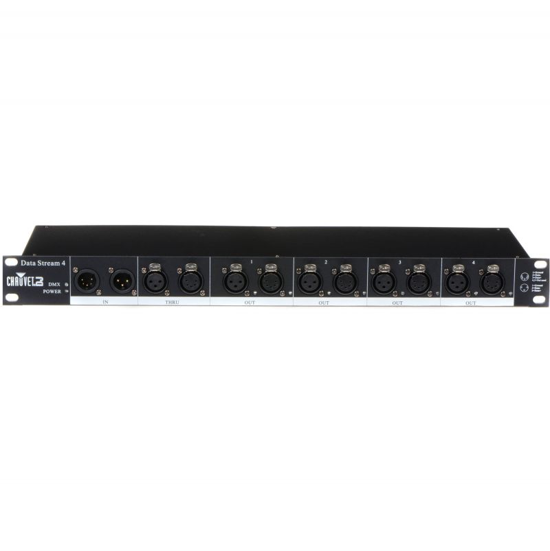 Data Stream 4 es un distribuidor de señal DMX, para enviarla a cuatro salidas independientes de 3 y 5 pines. Cuenta con un puerto “Thru” adicional para copiar la señal de paso hacia otras unidades Data Stream incrementando la cantidad de salidas de DMX.