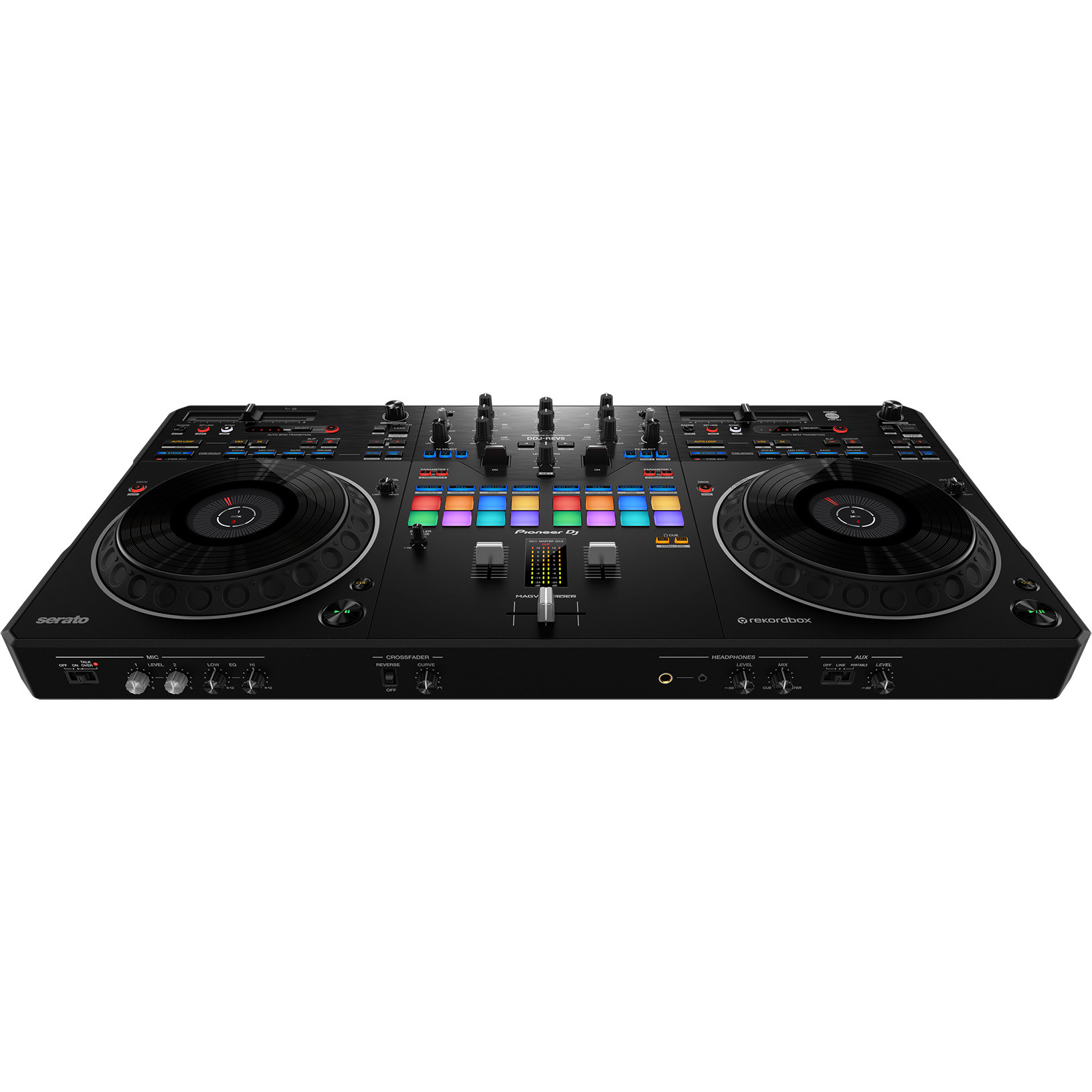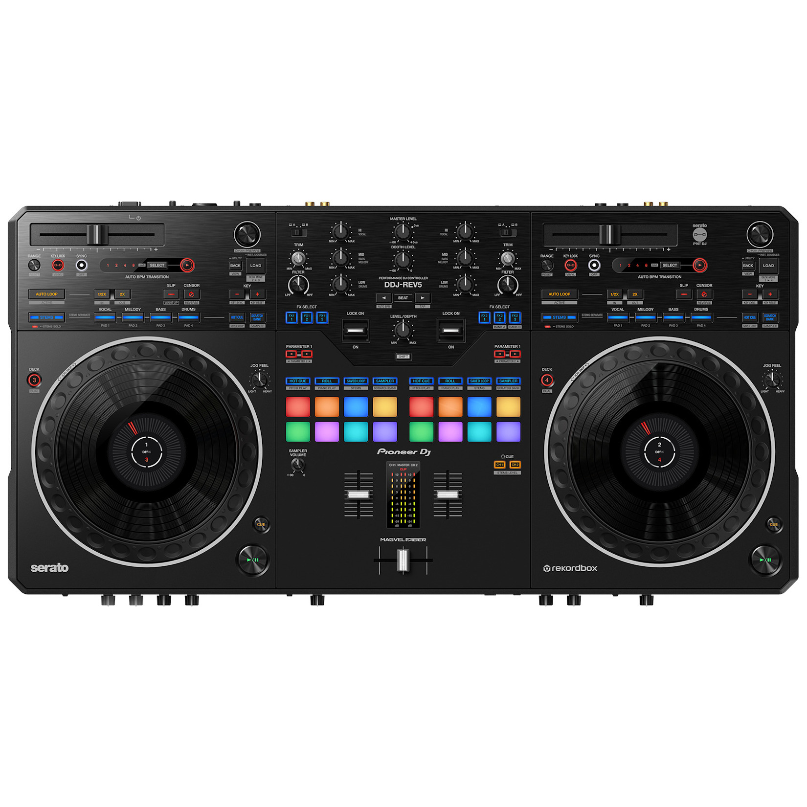El DDJ-REV5 es un controlador de nueva generación compatible con Serato DJ Pro y rekordbox. Esta unidad de 2 canales ofrece una auténtica experiencia de scratch y características innovadoras que incluyen sus grandes jogs, MAGVEL FADER, botones dedicados para el control Stems, la primera transición automática de BPM y el modo Piano Play.