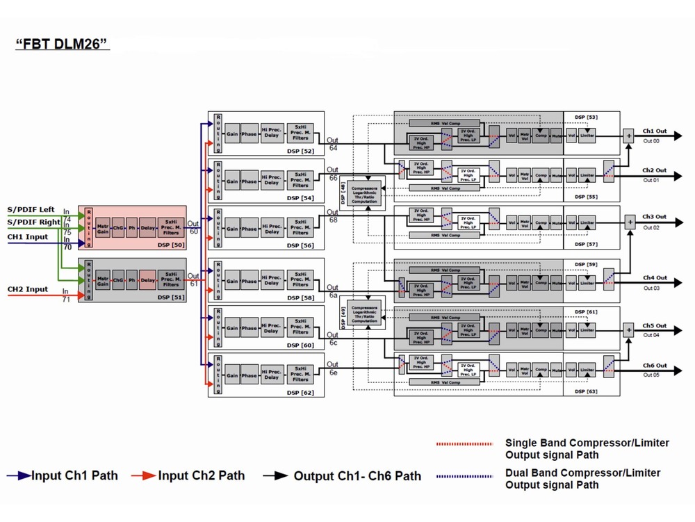 – Compresor RMS y limitador PEAK en cada canal de salida con constante de tiempo y algoritmo optimizado para la protección térmica y mecánica del altavoz, al tiempo que maximiza la salida sin distorsión audible