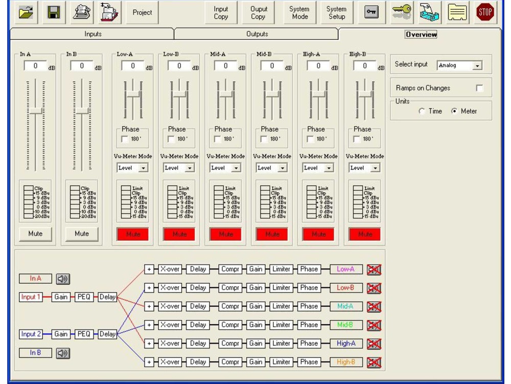 Cada salida tiene 4 filtros totalmente configurables, un retardo de 288.66ms máx. en un paso de 6.8us, ganancia, fase, crossover LO-pass/Hi-pass de 6 a 24db/Oct con Q estándar o personalizado, compresor RMS con knee suave y limitador de picos.