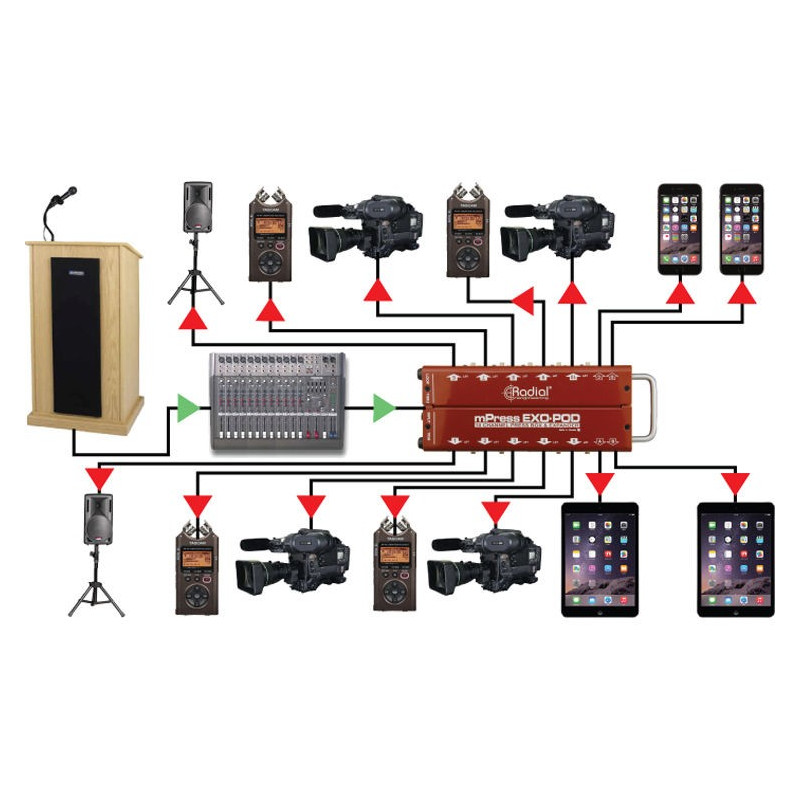 Splitter de transmisión pasivo que puede tomar una salida de línea balanceada desde una mesa de mezclas y distribuir la señal a hasta 14 dispositivos de grabación. También se puede utilizar junto con la caja de prensa Radial mPress master para crear una solución modular que proporciona cientos de fuentes de prensa individuales