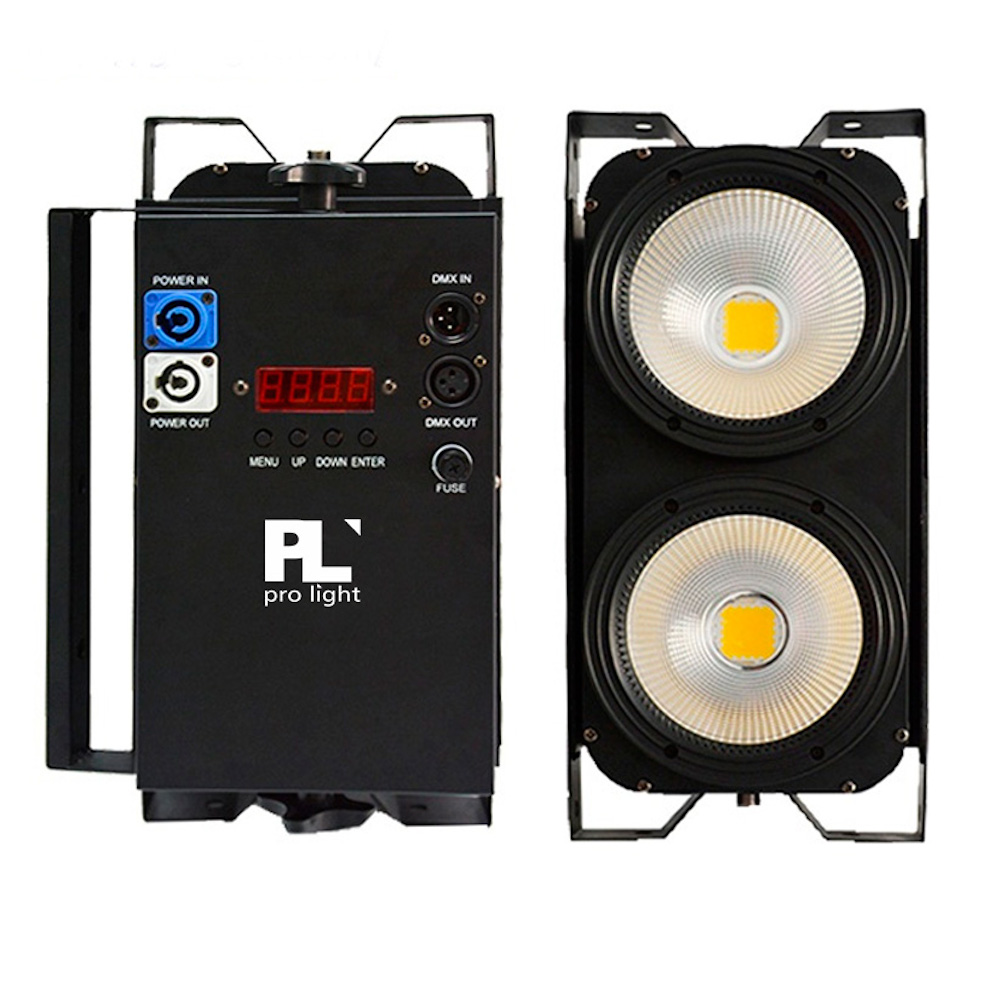 Blinder para eventos en vivo GZ2B de PL Pro Light, incluye doble LED de 100w cada uno con luz blanco cálido. Control por DMX o al ritmo de la música. Este blinder incluye difuminado, strober y relevos.
