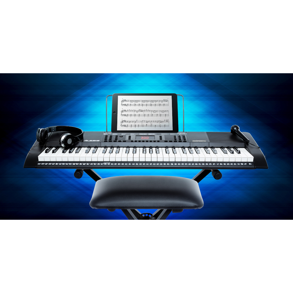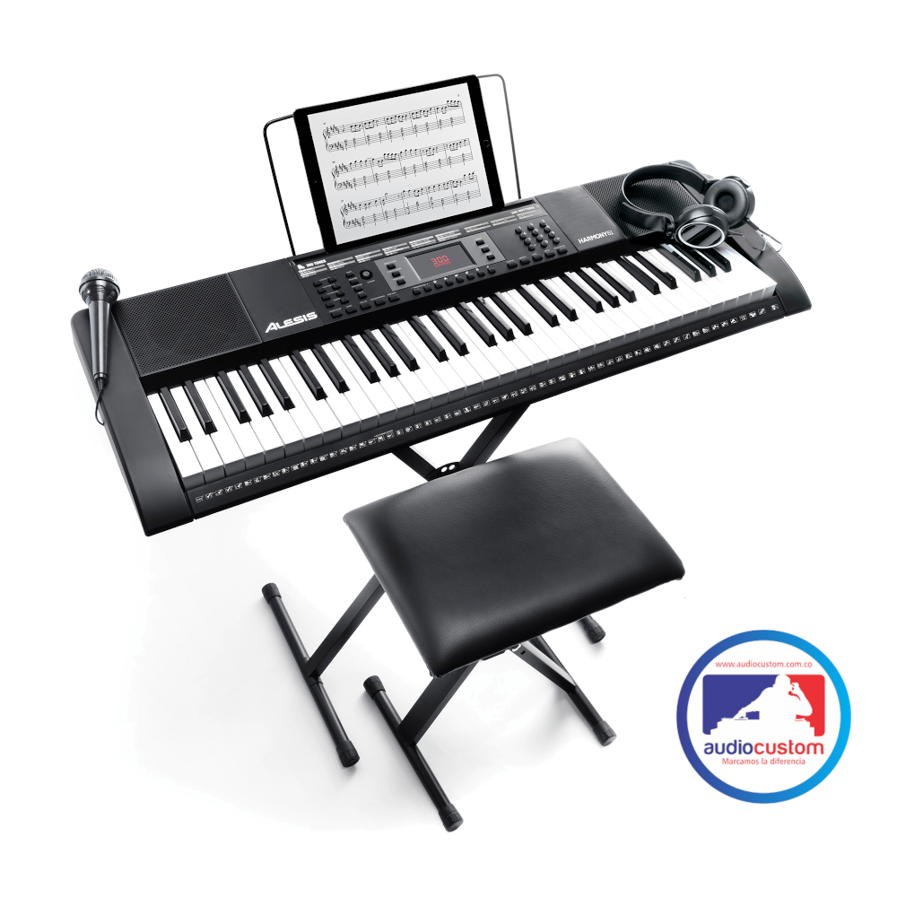 Teclado Alesis de 61 teclas estilo piano con parlantes incorporados, 300 sonidos, 300 ritmos incorporados, 40 canciones de demostración, el conector de audifonos de 1/8”silencia los altavoces para la práctica privada, incluye Micrófono, Audífonos, Atril de descanso para sujetar al teclado para partituras, Base para el teclado, Adaptador de corriente, Guía del usuario y Manual de seguridad y garantía.
