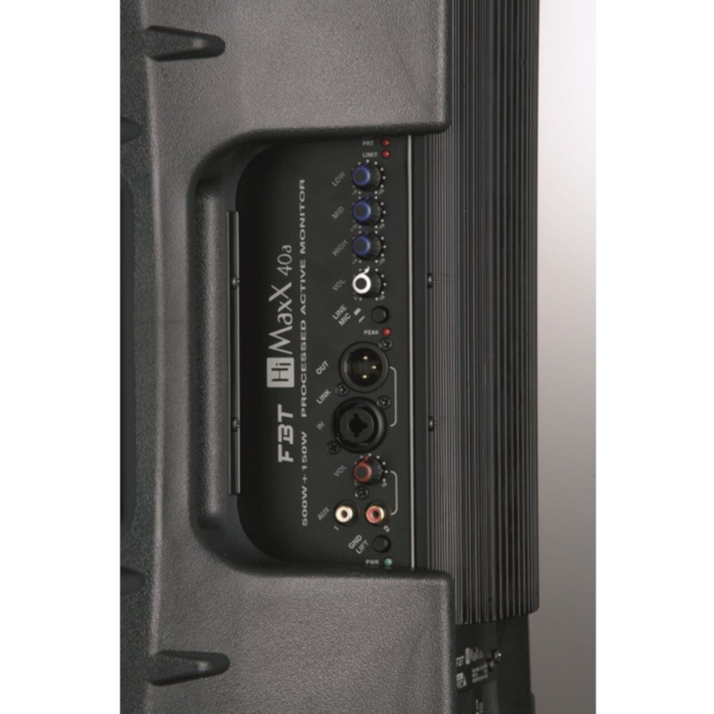 El HiMaxX 40a es un altavoz activo de 12″ con un controlador de compresión B&C de 1″ que cuenta con un amplificador DSP de 500 W + 150 W RMS – 133 dB SPL. Cuenta con una robusta carcasa moldeada de polipropileno inyectado con gas, diseñada en Italia para contener resonancias no deseadas.