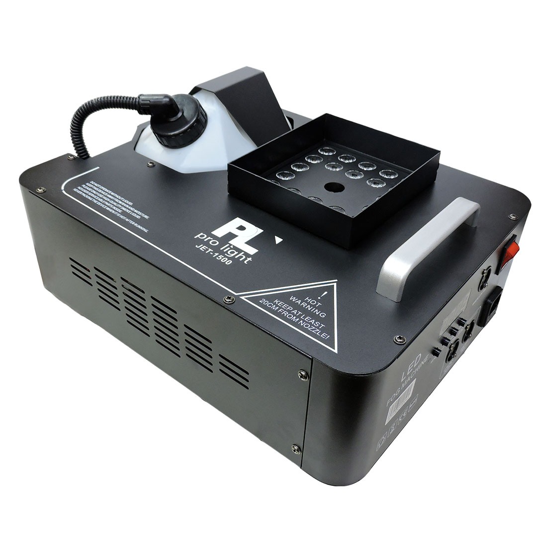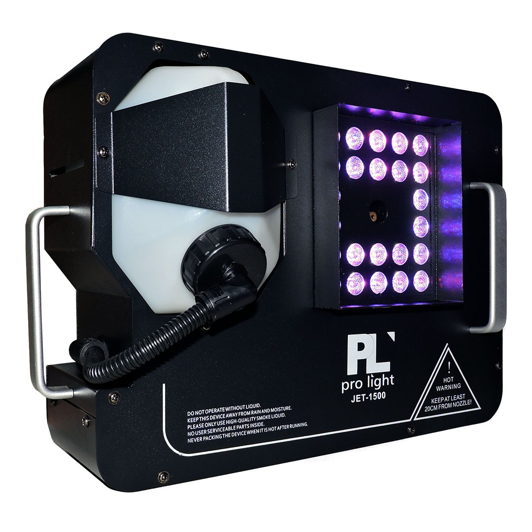 La JET-1500 de PL Pro Light es una maquina de humo de expulsión vertical de alta potencia con efecto de colores, gracias a su red de LEDs RGB 3 en 1 en colores verde, azul, rojo. Creando un efecto elegante similar al Co2, la JET-1500 incorpora un tanque de 2.5 Litros que brinda una expulsión de hasta 20.000 pies cúbicos por minuto hasta una altura de 6 metros. Su tiempo de calentamiento es de 5 minutos para expulsiones mas rápidas.