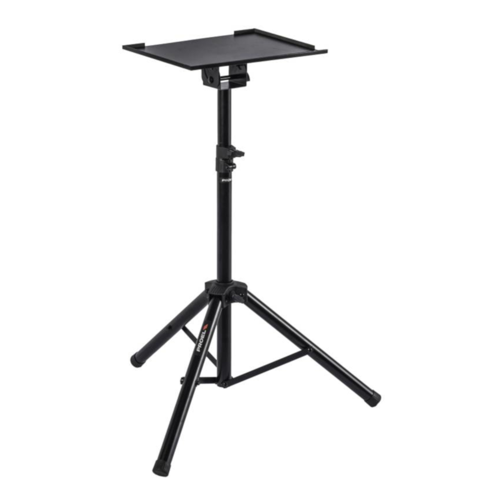 KP875 Base Profesional para portátil / proyector ajustable en altura con base de trípode; Placa superior de ángulo variable. Disponible en negro mate. Ideal para cualquier situación, conferencias, estudios de grabación, oficinas, sonido en vivo, iglesias , etc. Proel