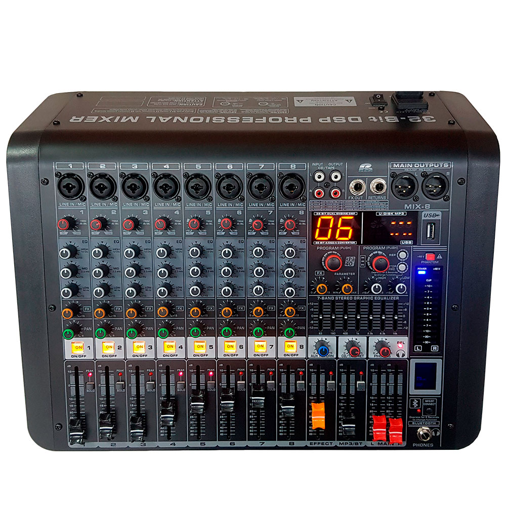 La MIX-8 de Pa Pro Audio es una consola de 8 canales con tecnología Bluetooth para reproducción de audio con pantalla digital para gestión de las pistas, ademas de conexión USB para MP3 o para grabación de la mezcla en vivo. +48V de alimentación Ghost para micrófonos, ecualizador de 7 bandas para la salida principal y ecualizador de 3 bandas por canal, ajustes de efectos por canal con 16/99 opciones distintas incorporadas con DSP, cada canal incluye interruptor de Mute (Silencio) Salida de monitor para audífonos, una construcción externa elegante y resistente a largas horas de uso y transporte.