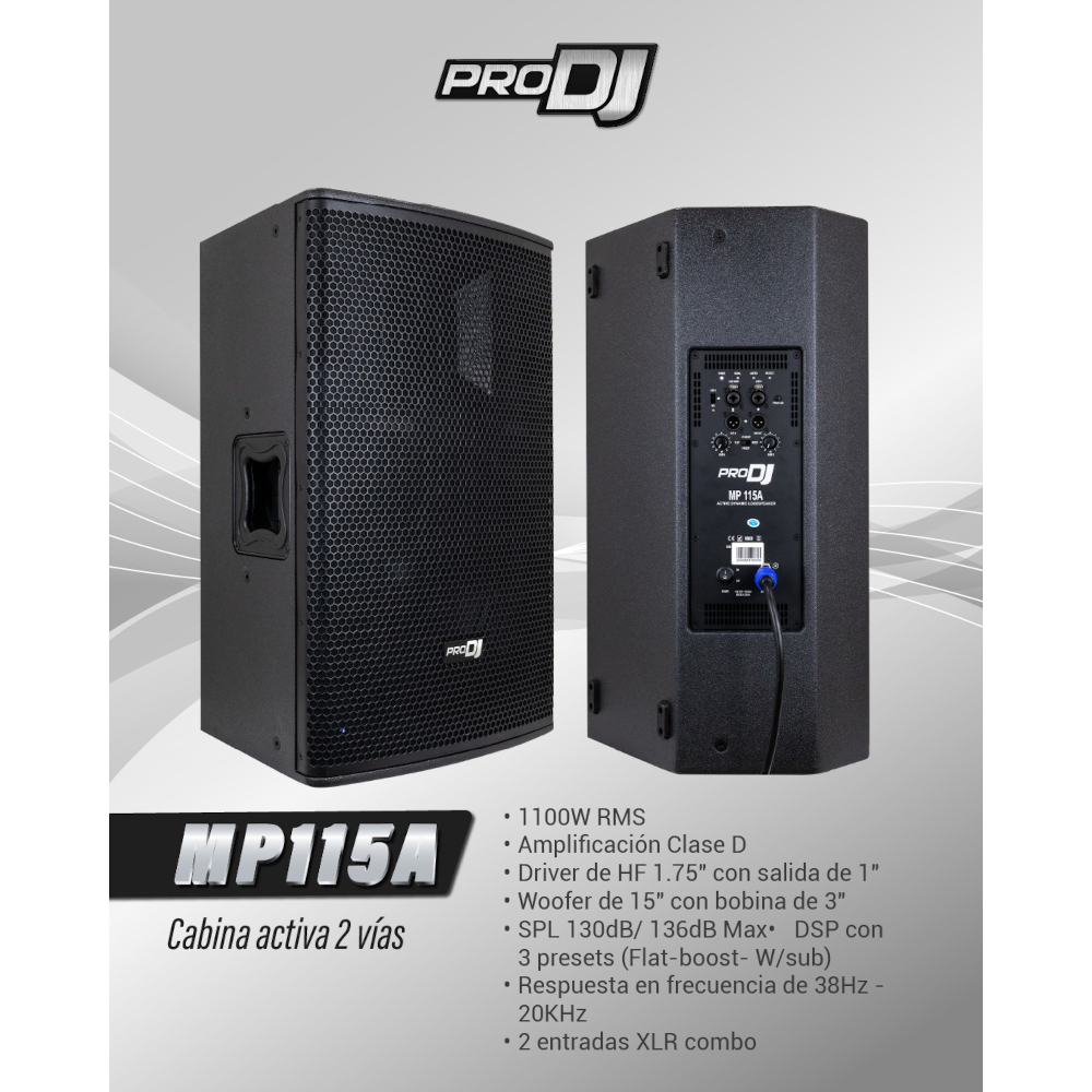 La cabina activa PRO DJ MP115A de 15” ofrece un rendimiento excepcional con 1100 W RMS, amplificador Clase D, DSP con presets, y diseño robusto en madera. Ideal para escenarios exigentes gracias a su SPL máximo de 136 dB y conectividad versátil. Ideal para DJ, bandas o instalaciones profesionales.