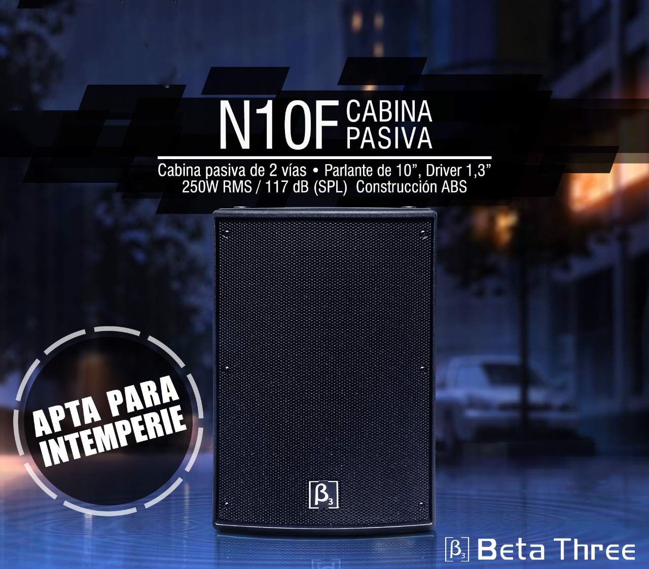 Cabina pasiva de 10″ a 2 vias Apta para intemperie Driver de compresion de 1.3″ Respuesta de frecuencia 55Hz-18kHz Potencia: 250 W (RMS) Sensibilidad (a 1 m) 95 dB – 125 dB Max Impedancia 8Ω Dispersion: 90° x 90° Entradas Fuente de alimentación: Speakon x 2 Inlcuye base para anclar en pared Dimensiones 32x 30 x 46 cm Peso bruto 12 kg