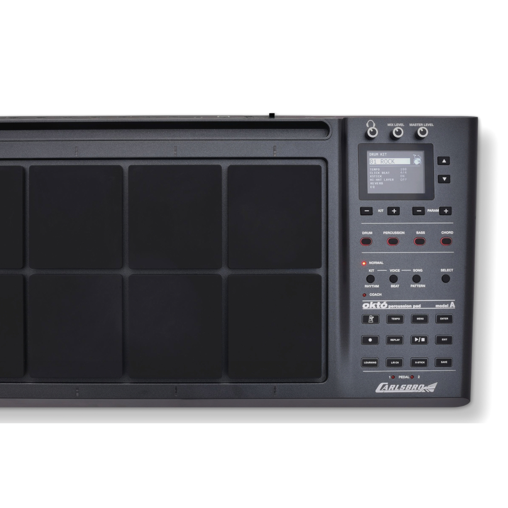 El juego de almohadillas de percusión Okto A cuenta con 8 almohadillas de goma configurables por el usuario, resistentes y de alta respuesta. 2 interruptores de pedales para controlar el bombo y el charles. 408 voces de batería, 30 kits de batería preestablecidos, 20 kits de batería de usuario. Funciones de grabación, reproducción, demostración y enseñanza, incluidos potentes modos de práctica/enseñanza paso a paso de caja, ritmo y batería completa.