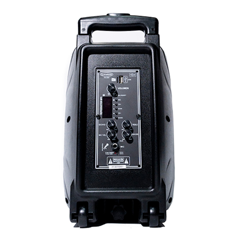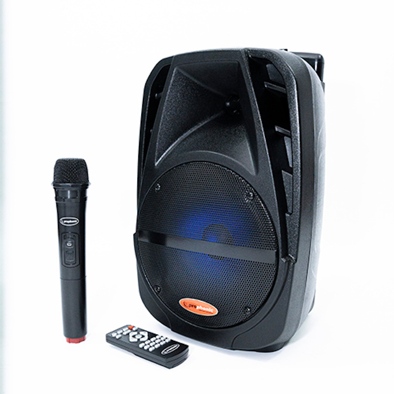 Cabina recargable PROPHONIC Parlante: 8” woofer 40 oz de imán, 1” de bobina, Funciones: USB, SD, Radio FM, MP3, BT, AUX. 1 MICRÓFONO VHF 20mts max. de alcance. LUCES audio rítmicas