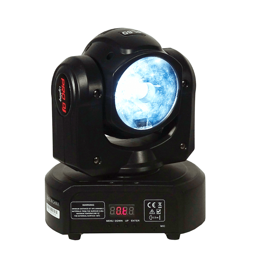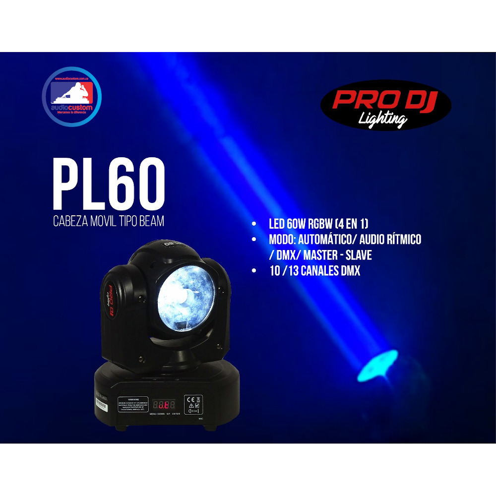 Cabeza móvil tipo beam ideal para eventos en vivo. LED 60W RGBW (4 EN 1). 70 W Modo: automático/ audio rítmico/ dmx/ master – slave. 10 /13 canales dmx. angulo de apertura 4.5°.