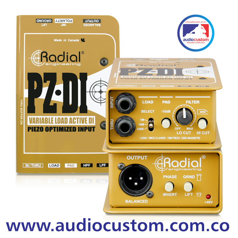 La PZ-DI de RADIAL es la caja directa activa para microfonos piezoelectricos mas poderosa de la marca. Ideal para studio y sonido en vivo. Entrada sencilla, interruptor para sumar los instrumentos estéreo a mono • Filtro de corte bajo, -15 dB PAD y con inversión de polaridad. Se alimenta de los 48v que salen de la mixer. FIltros HPF para control del hum del instrumento.