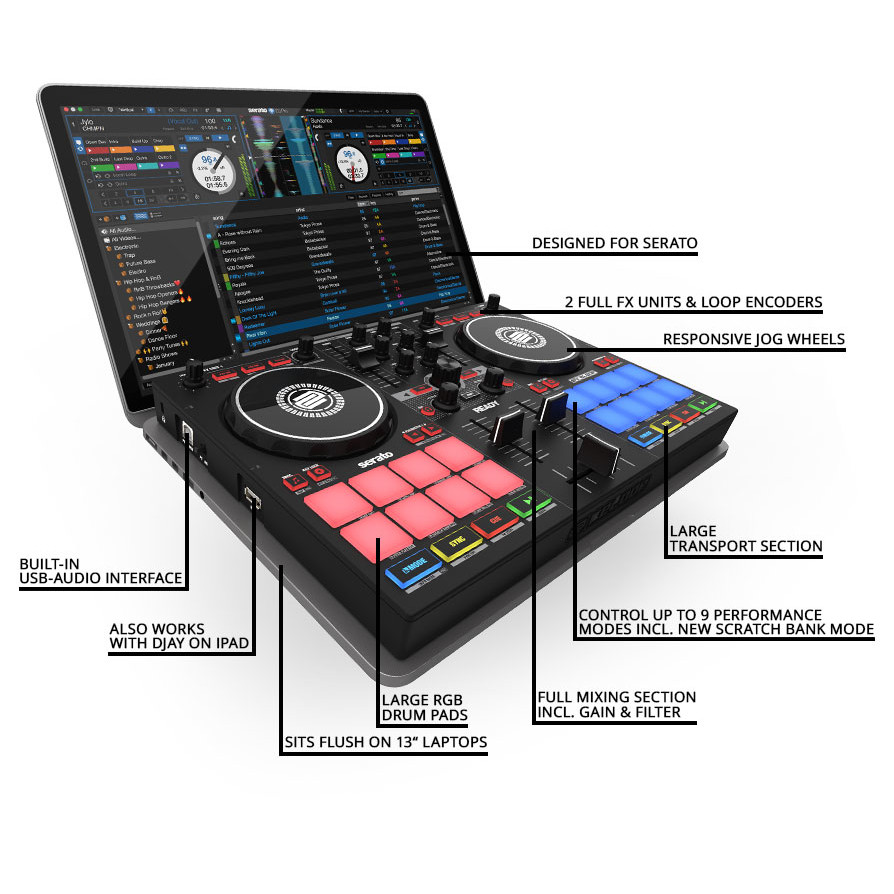 Controlador compacto de alto rendimiento para Serato; Conjunto completo de funciones: 16 pads RGB grandes, 9 modos de rendimiento incl. nuevo soporte Scratch Bank, 2 unidades FX; Ideal como solución de DJ en casa y como dispositivo de preparación portátil profesional