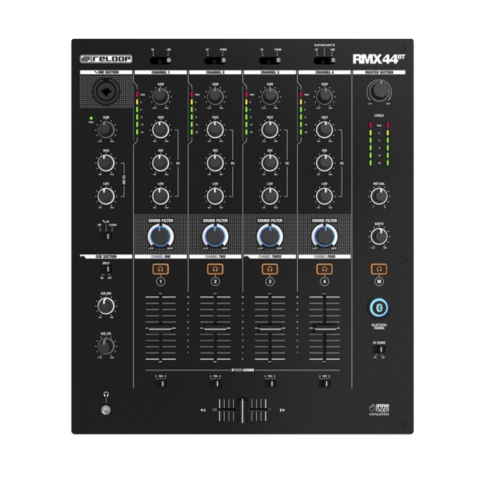 El Reloop RMX-44 BT es un mezclador de club de DJ Bluetooth de 4 canales con un diseño clásico, que incluye una entrada Bluetooth con función cue, que ofrece numerosas posibilidades de aplicación. El diseño intuitivo del mezclador Club garantiza una visión general simple y permite a los artistas experimentados orientarse de inmediato.
