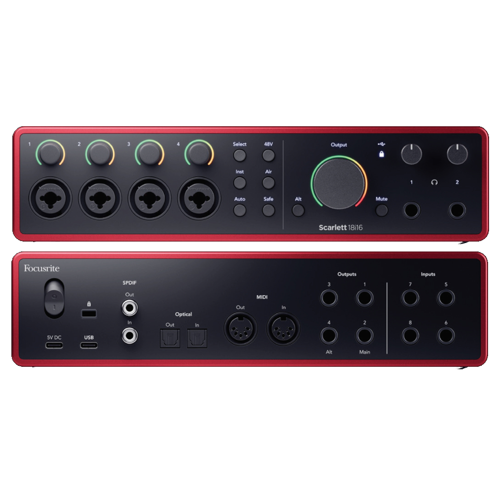 Scarlett 18i16 es ideal para la grabación multipistas. Tiene convertidores de grado profesional, tomados directamente de la línea RedNet de Focusrite. Los cuatro preamplificadores de micrófono de 4ª generación tienen una impresionante ganancia de 69 dB, capaz de capturar las interpretaciones más dinámicas. Los modos Auto Gain y Clip Safe se encargan de los niveles, para que puedas enfocarte en la toma. Scarlett 18i16 también es perfecta para integrar tu DAW a tus equipos, puesto que tiene suficientes E/S analógicas y digitales para conectar múltiples instrumentos, procesadores y efectos externos, y gestionar ruteos complejos con total facilidad, con el software Focusrite Control 2.