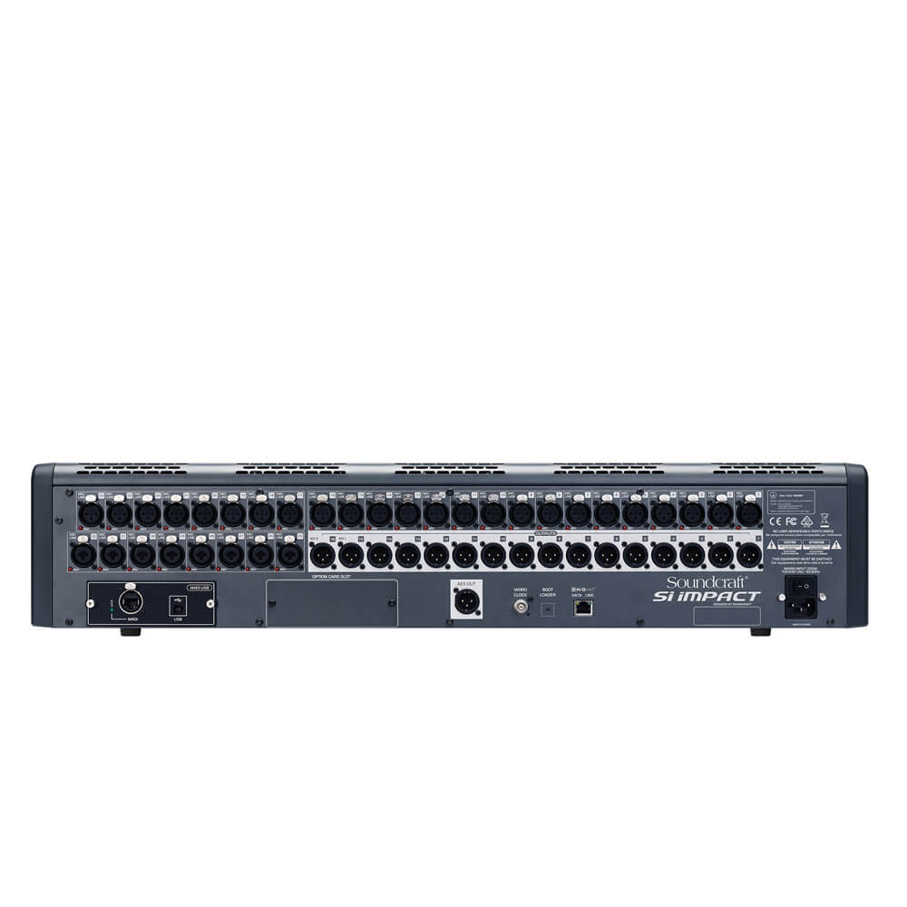 La Si Impact ofrece 32 entradas micro/línea, 40 canales de entrada DSP (32 entradas mono y 4 canales estéreo/retornos) y 31 buses de salida (todos con proceso DSP y ecualizador gráfico) con 20 buses auxiliares de subgrupo y cuatro buses matriciales mono/estéreo. 8 conectores XLR/jack están disponibles para entradas de línea e instrumentos, mientras que un ecualizador paramétrico de 4 bandas está disponible para cada canal y cada bus. El Si Impact también ofrece efectos y proceso de dinámica de calidad de estudio, de BSS, Lexicon y Dbx: las compañías “hermanas” de Soundcraft, todas ellas pertenecientes también al grupo Harman.