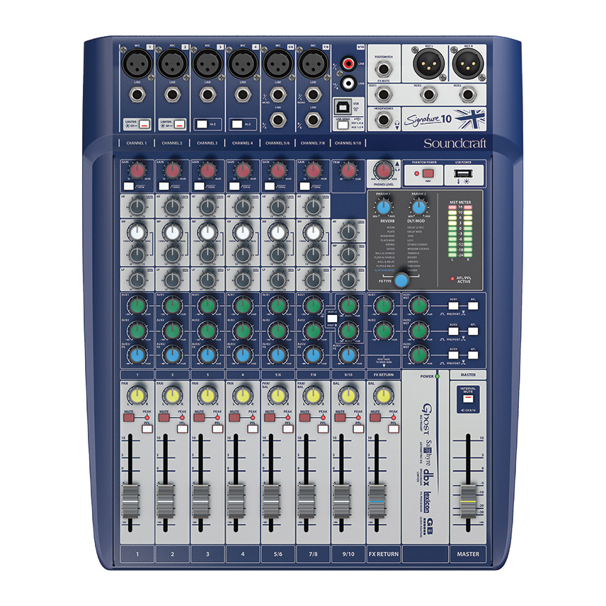 Mixer de de 10 canales, 6 con previos de micro Ghost; 1-2 con limitadores dbx; 3-4 con conmutador de alta impedancia; 5/6 y 7/8 Micro o Línea estereo con Filtro pasa altos; Alimentación Phantom general (48V). 3 bandas de ecualización con frecuencia seleccionable en medios. 9/10 Entradas linea RCA con ecualizacion de 3 bandas. Faders de 60mm. 3 Auxiliares todos Pre/post Fader; Procesadopr de efectos Lexicon en Aux3 con posibilidad de silenciamiento de efecto por pedal; Salida de grabación USB.Entrada USB con envio a Master o Aux 1-2. Indicadores led de 10 segmentos. Conectores XLR y Jack metálicos.