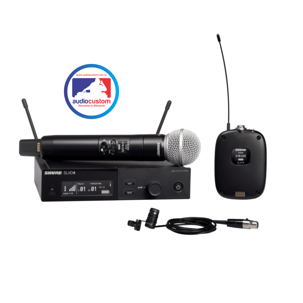 Sistema inalambrico SLXD con (1) transmisor de mano SLXD2/SM58, (1) transmisor tipo bodypack SLXD1/WL185 y receptor digital SLXD4 sencillo