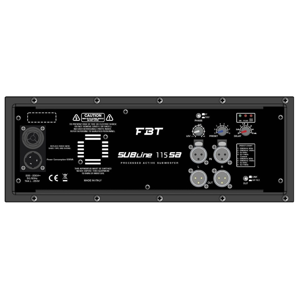 - Panel de control con entradas/salidas estéreo XLR, volumen, preajustes de ecualizador, retardo de 8 pasos de 0,25 ma 3,5 m, interruptor de inversión de fase 0°-180°, 3 indicadores LED de estado