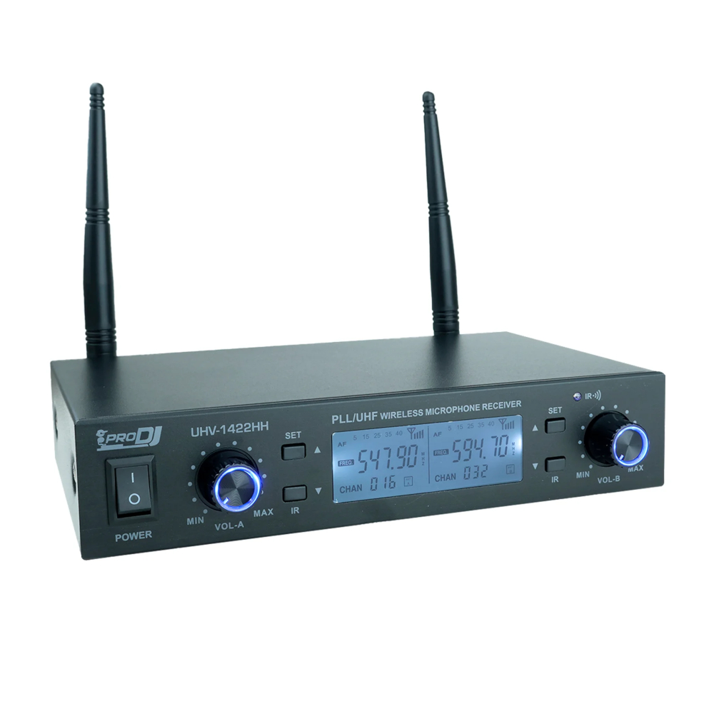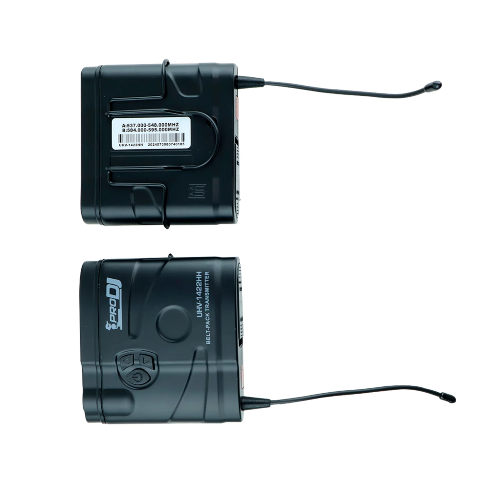El sistema de micrófono doble de diadema UHV-1422HH de PRO DJ ofrece libertad de movimiento y calidad de sonido excepcional en un rango de hasta 50 metros. Con frecuencias variables en el rango de 460 a 970 MHz y una respuesta de frecuencia de 40Hz a 17kHz, este sistema es ideal para presentaciones y eventos profesionales. Cuenta con una alta relación señal/ruido de 90 dB y bajo THD (<1%), garantizando un sonido claro y preciso, además de una construcción robusta para una mayor durabilidad.