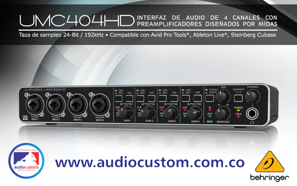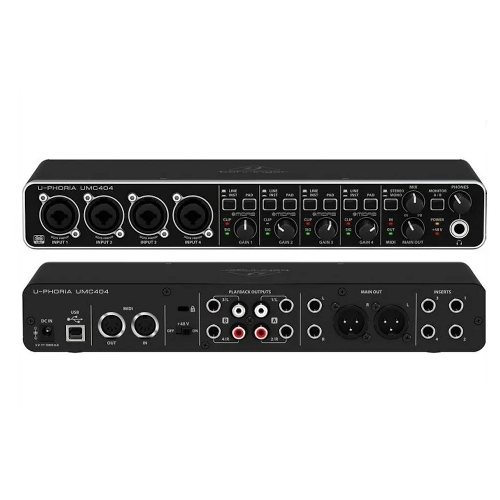 Con la interface BHERINGER UMC404HD tendrás a tu disposición 4 entradas para grabar en simultaneo, 2 salidas para tus monitores, salida de audífonos en plug de ¼ y la posibilidad de usar micrófonos condensados ya que nos proporciona en sus entradas la posibilidad de adicionar phontom power 48v para estos. Esta interface incluye cable usb tipo B de 1.5 metros.