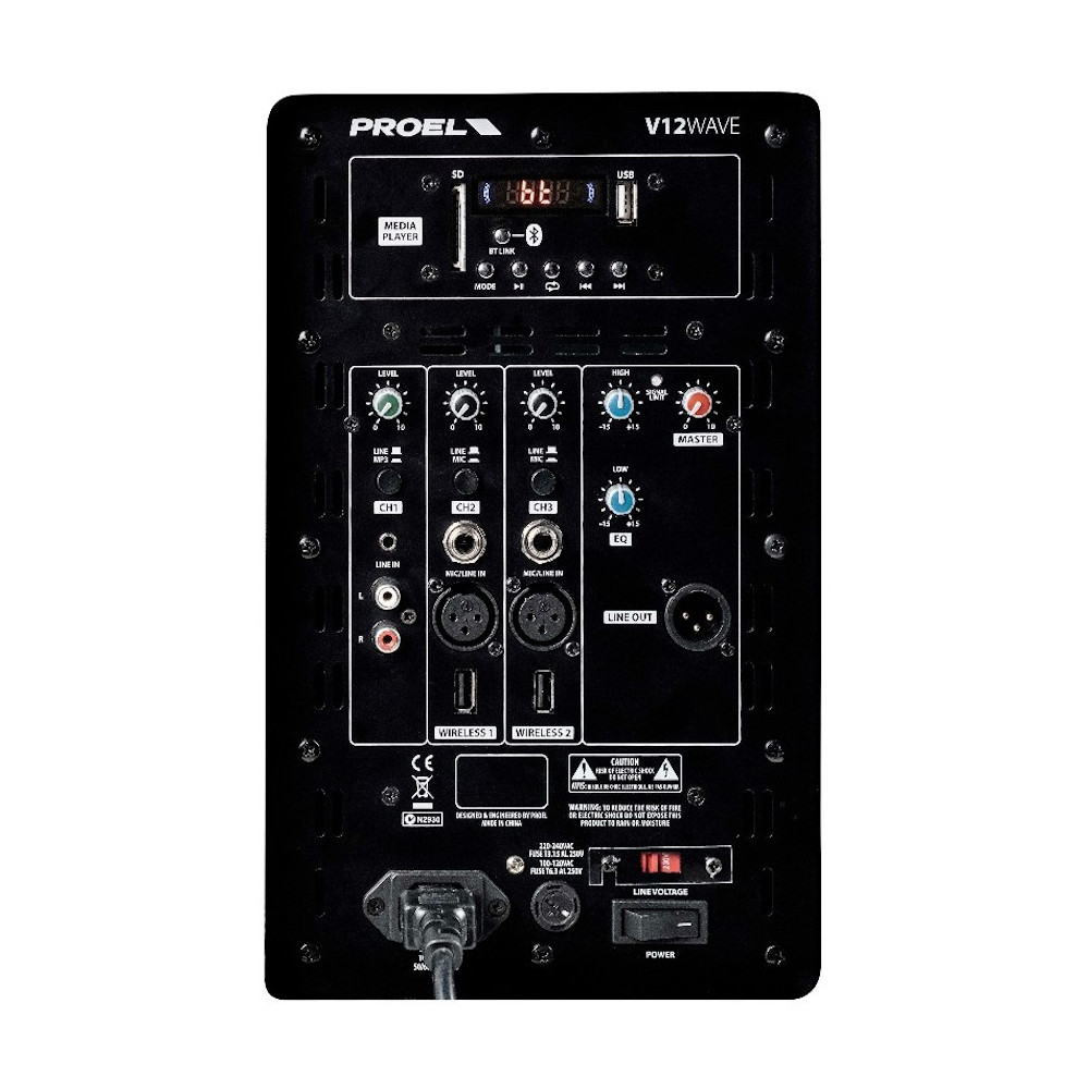 Proel V12WAVE Con WAVE PROEL ha ampliado aún más el potencial de la aclamada SERIE V al agregar a los gabinetes de PP livianos y ultra duraderos, al sonido claro y preciso y al potente amplificador de 600 W una sección de mezclador de 3 canales ultra versátil.