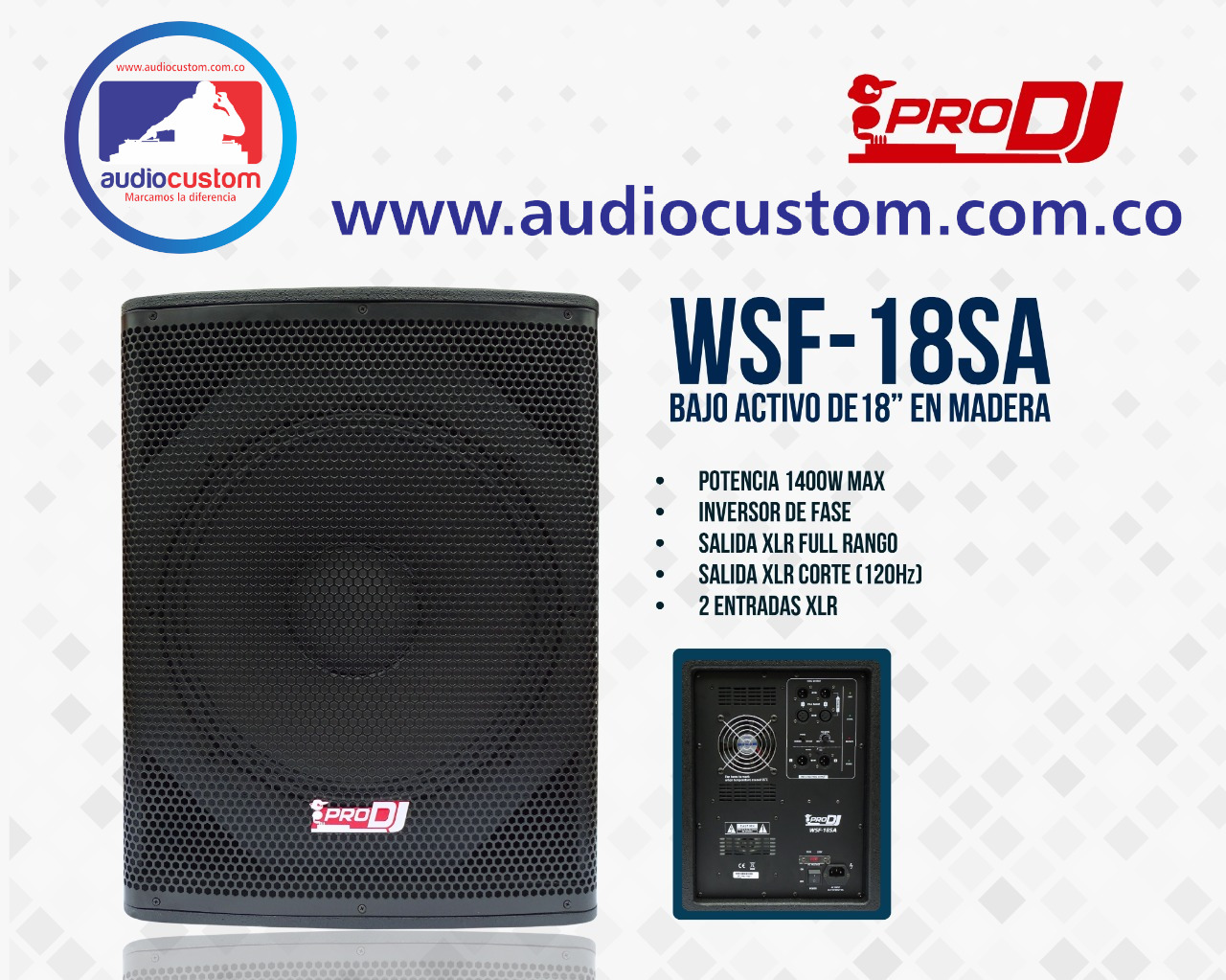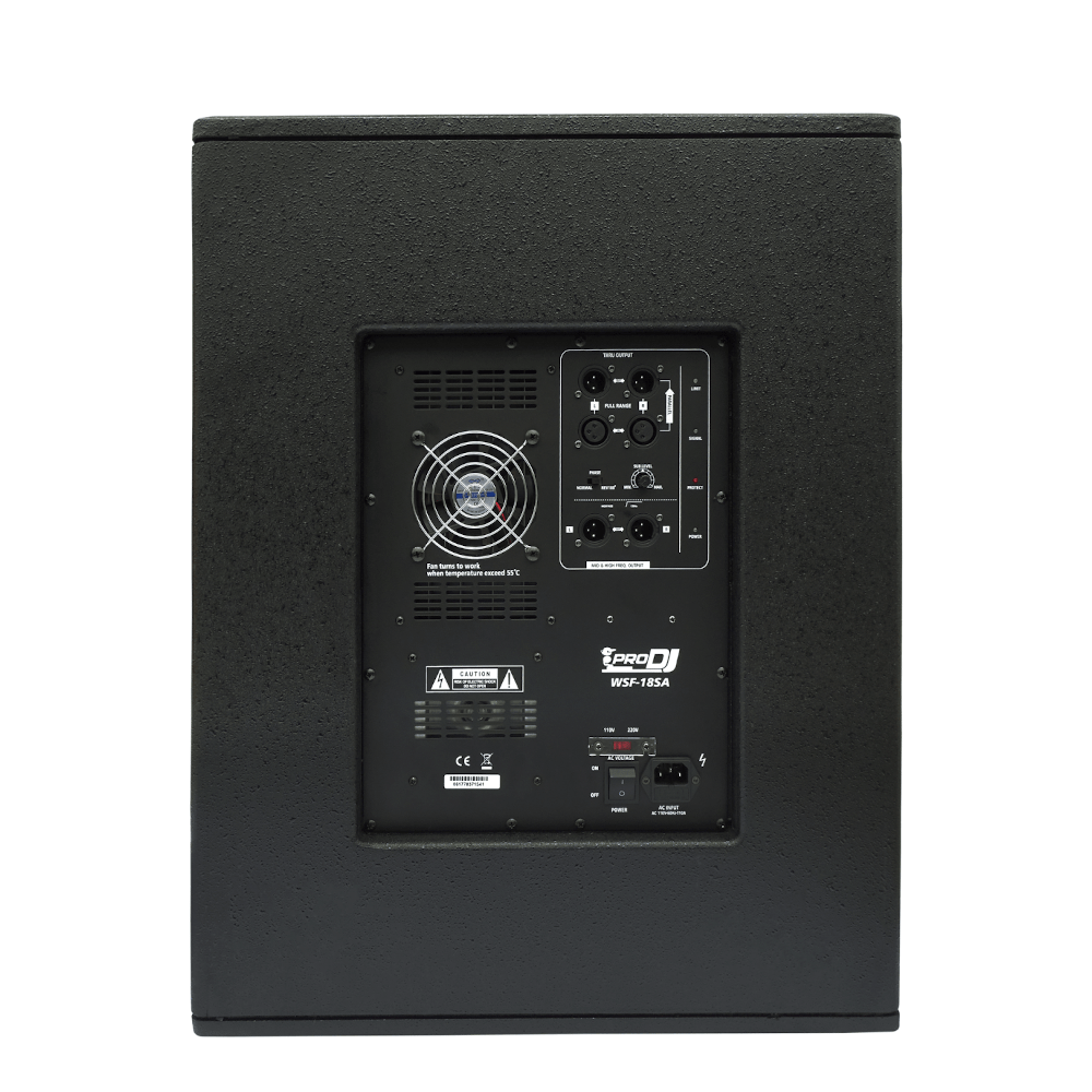 Subwoofer activo en Madera Parlante: 18″ Potencia 490w RMS Respuesta en frecuencia 35hz -120hz Spl máximo 128dB Inversor de fase 2 Entradas XLR 2 Salidas XLR Peso: 44kg